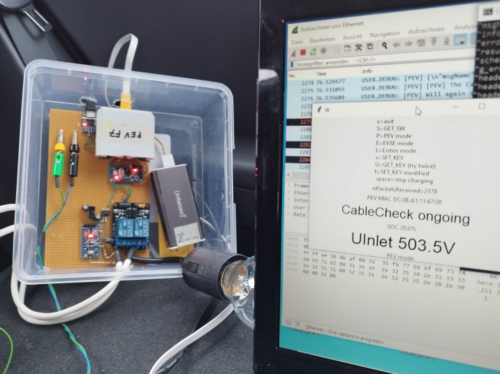 At the moment, the only really blocking point is: If I want to "sniff" the traffic between the real car and real charger, I'm able to set the key in the "sniffer" homeplug modem, and the network is formed. This is confirmed by sending a GetSoftwareVersion request, which is responded by three modems (charger, car, sniffer) correctly. So far so good. But the TCP traffic is not visible for the sniffer, I guess because it is too intelligent, it knows that the traffic is not intended for the sniffing notebook. This is a known behavior also for Ethernet switches, they learn the MAC addresses and do not forward traffic to ports which are not related to the destination MAC. I did not find a method, to configure the modem to just route everything from the RF port to the Ethernet port. That's why, the SnifferMode part of the project is stuck. Any idea welcome.