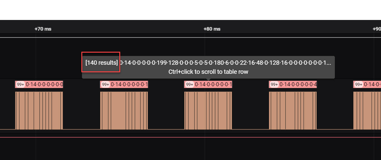 I am starting to get data now. The red serial stream starts at the same time each time, but the blue stream has a bit of jitter in the start signal. So I only have the red stream data to present so far. Not sure if motor serial or generator serial stream at moment. More later as I understand more.