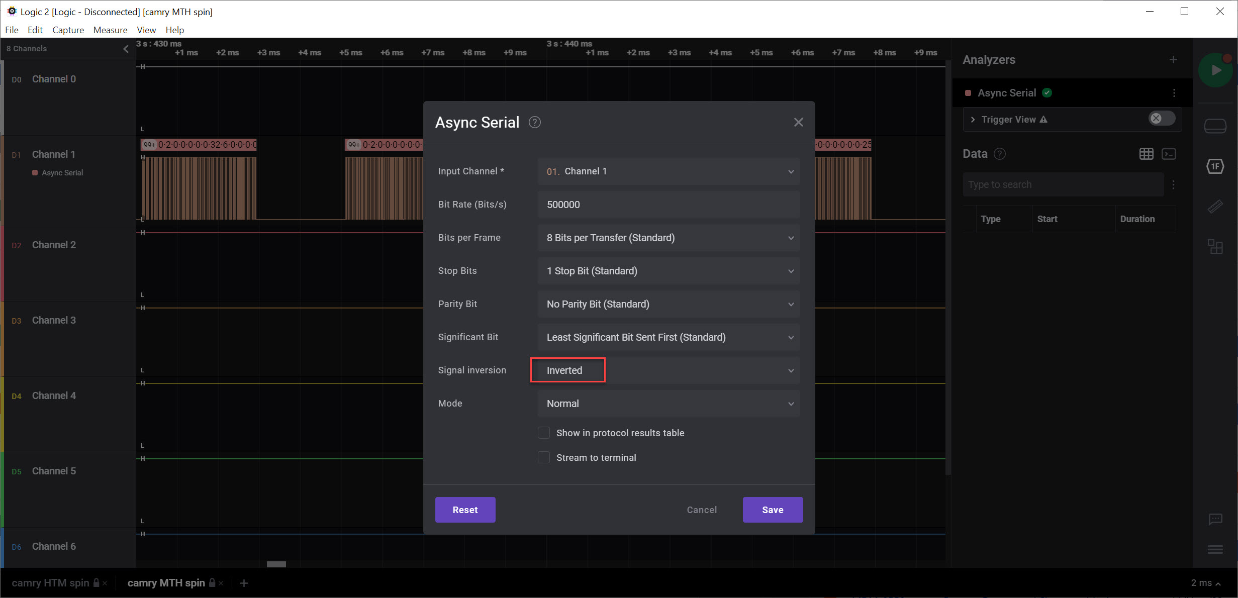 I captured some MTH data using Saleae Logic. When I use these settings, the data looks correct: