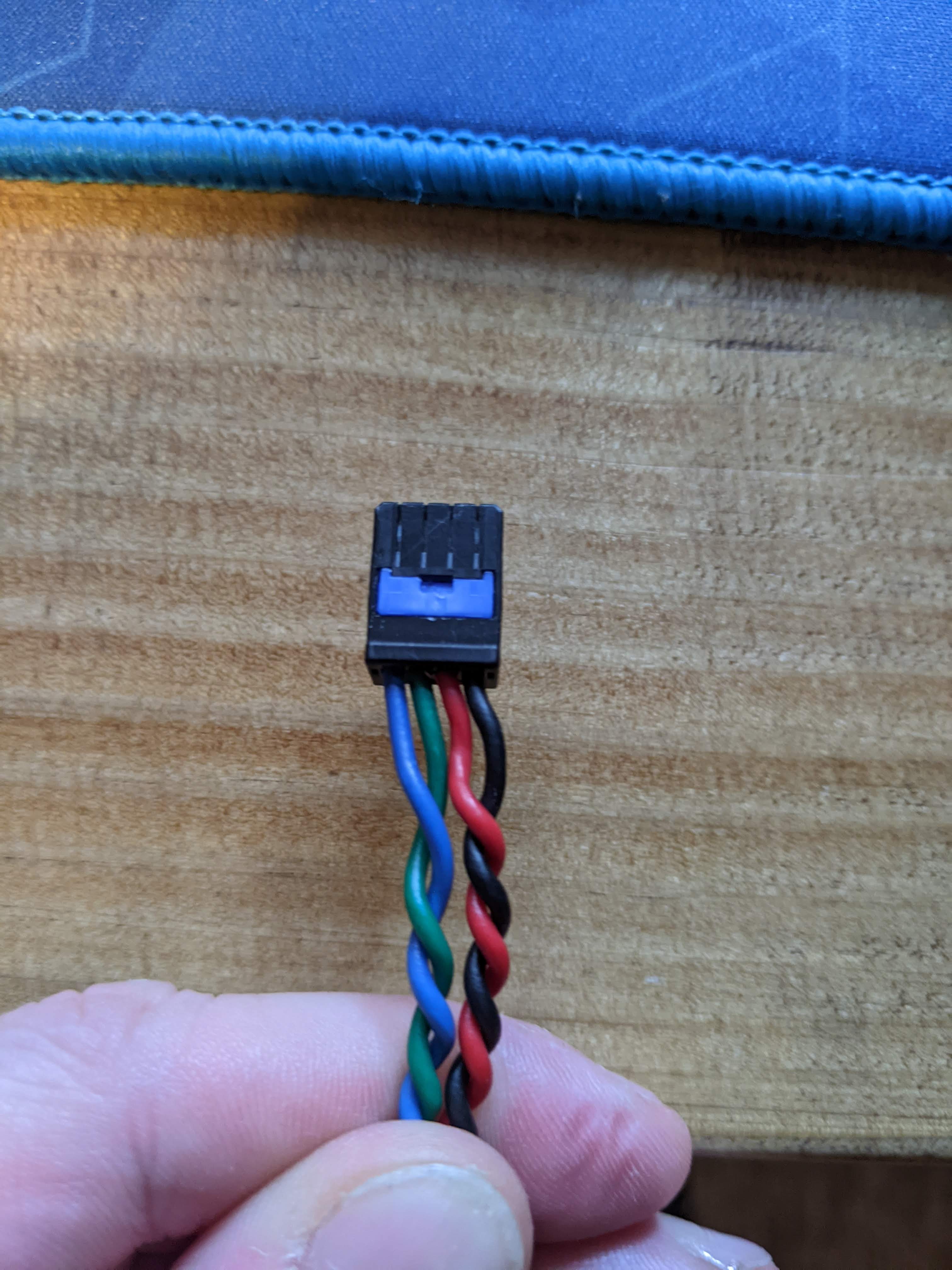 In this photo, the plug is upside down (release tab on bottom), and green/blue are the data pins.