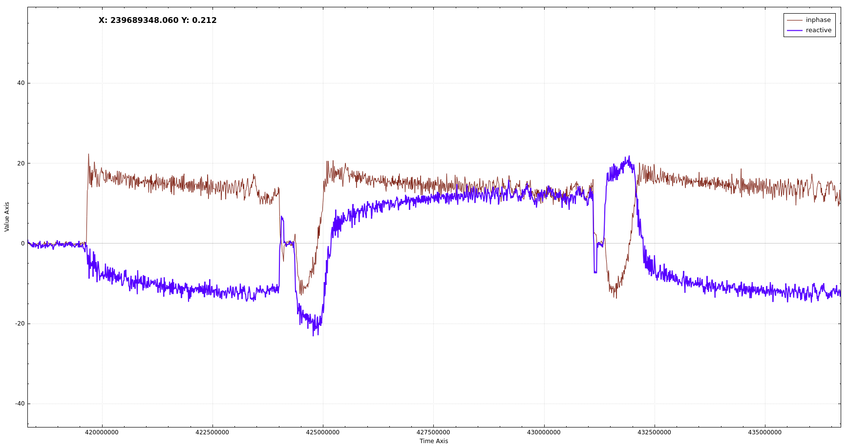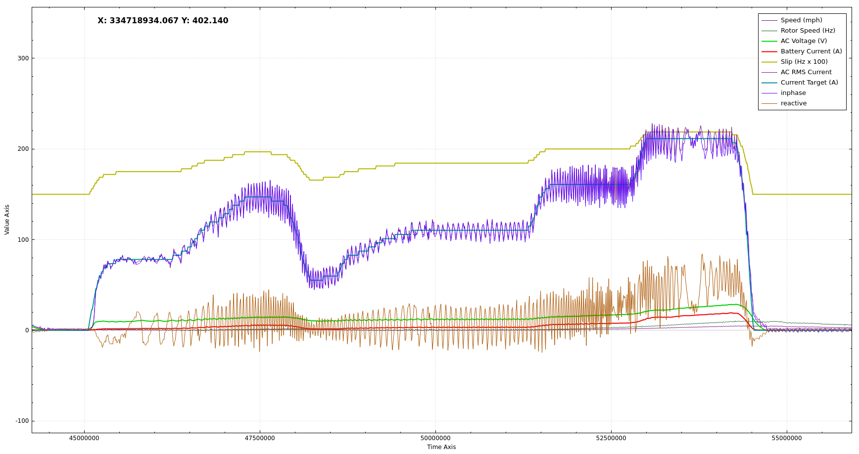 The inphase current (brown) shows a positive value during acceleration and a short negative period (regen braking) during the direction change. The direction of the reactive current (neither positive or negative, since it's at a tangent to voltage) depends on the rotor direction.