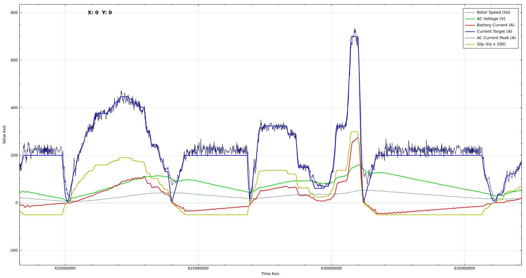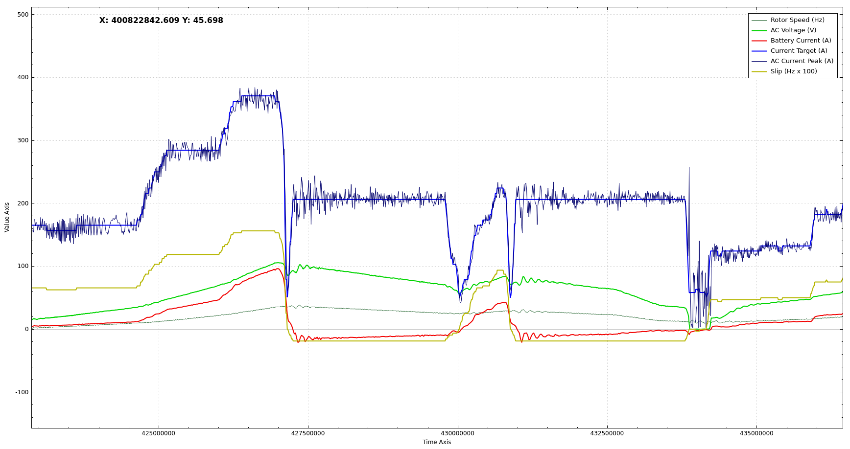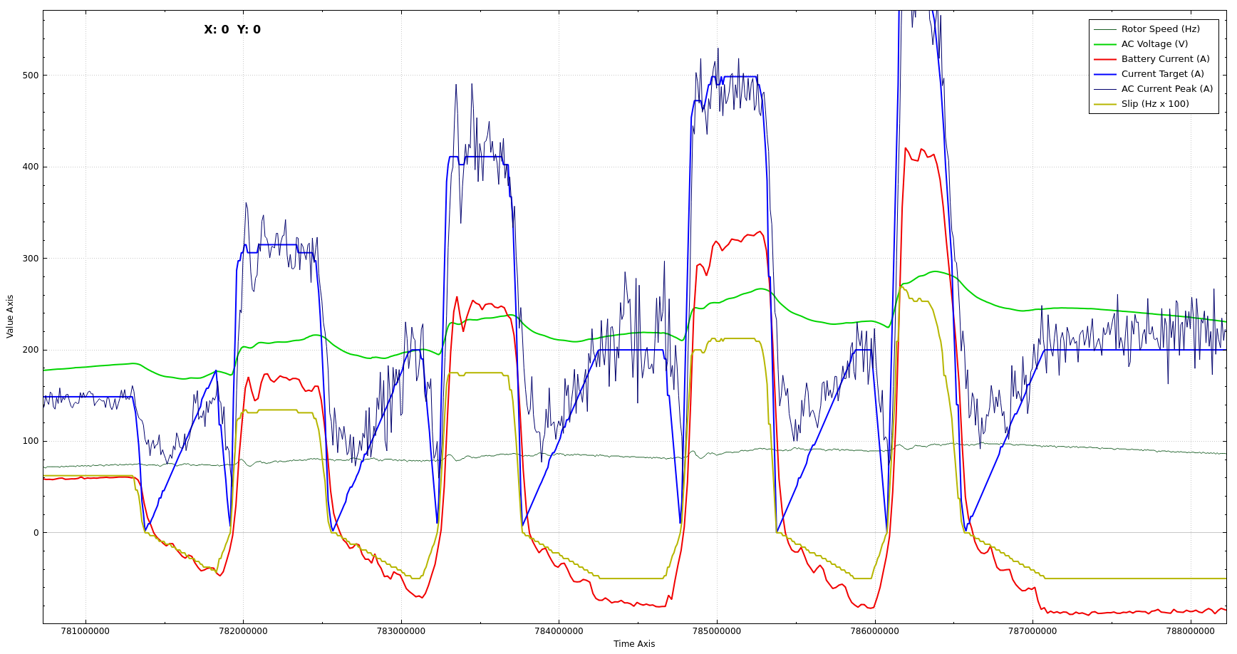 I suspect with more tuning these could be brought in a bit tighter, depending on how much regen is actually required. I've been testing with 200A AC current and 0.5Hz of slip, which gives up to 100A into the battery at higher speeds.