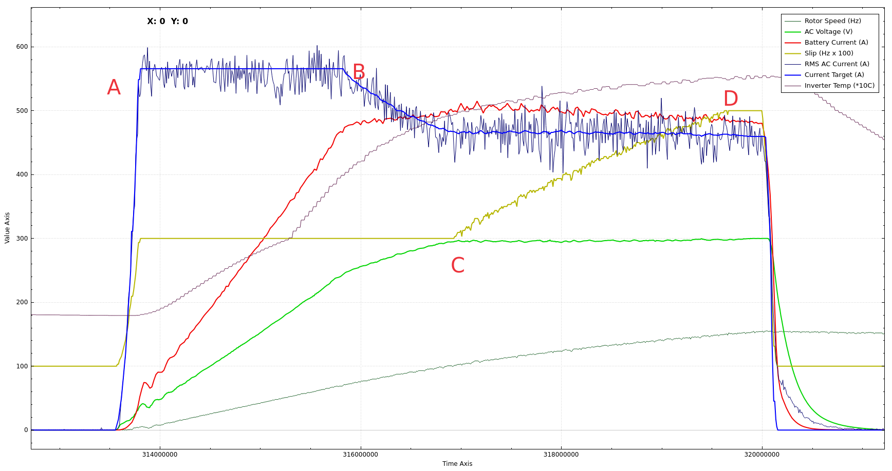 A: From a stationary start, when throttle goes to 100% the target current and measured current rise almost instantly to 560A RMS (configured by throtcur). Slip is set to slipmax (in this case 3.0Hz).