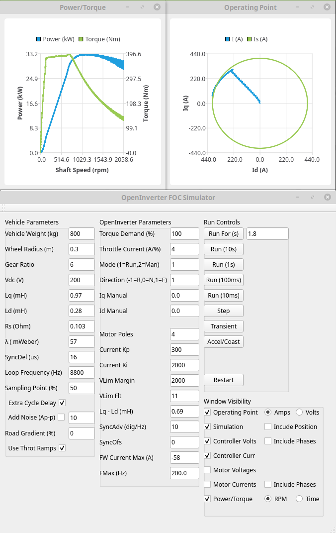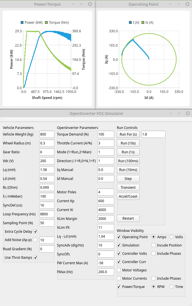 The last is field weakening. Essentially motors like the Outlander's are permanent magnet based. This means that they act as generators too. If the motor speed rises above base speed they start to push power back into the battery unless the inverter prevents it. The base speed varies with battery voltage and for the Outlander motor is it something like 4.5krpm with a 360V supply (45mph ish). If you drop the voltage to 200V this frequency drops to 2.5krpm (25mph ish). At 140mph the voltage potentially generated by the motor is quite scary! Now the inverter should be able to prevent this but unfortunately the OpenInverter code is still a little iffy here, it's a lot better than it was, but running at 140mph would probably be a bit too much to ask at the moment.