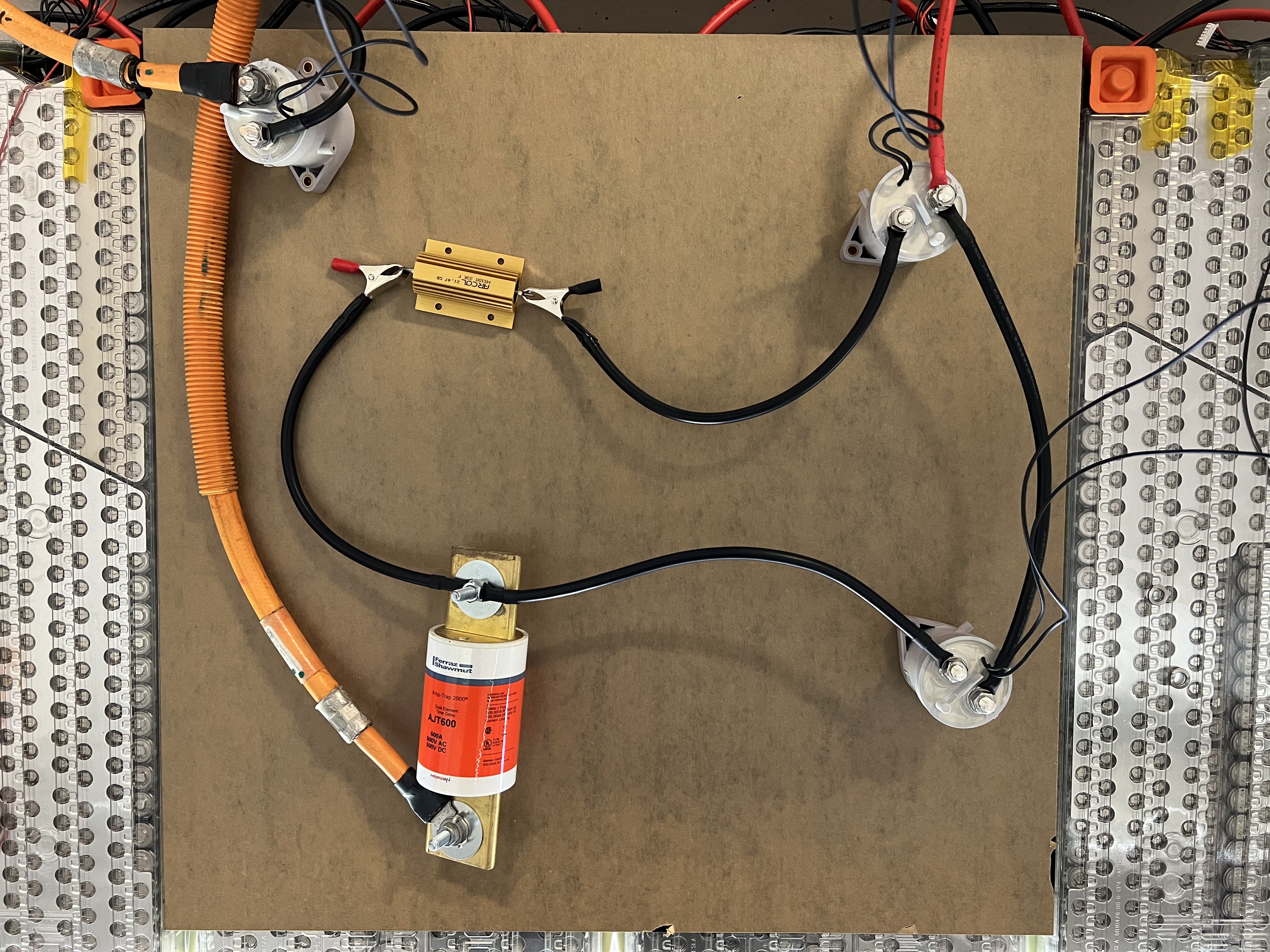I have three TE EV200 contactors, an Arcol HS 100 watt / 33 ohm resistor, and a Mersen 600a 500v fuse making up the HV wiring.