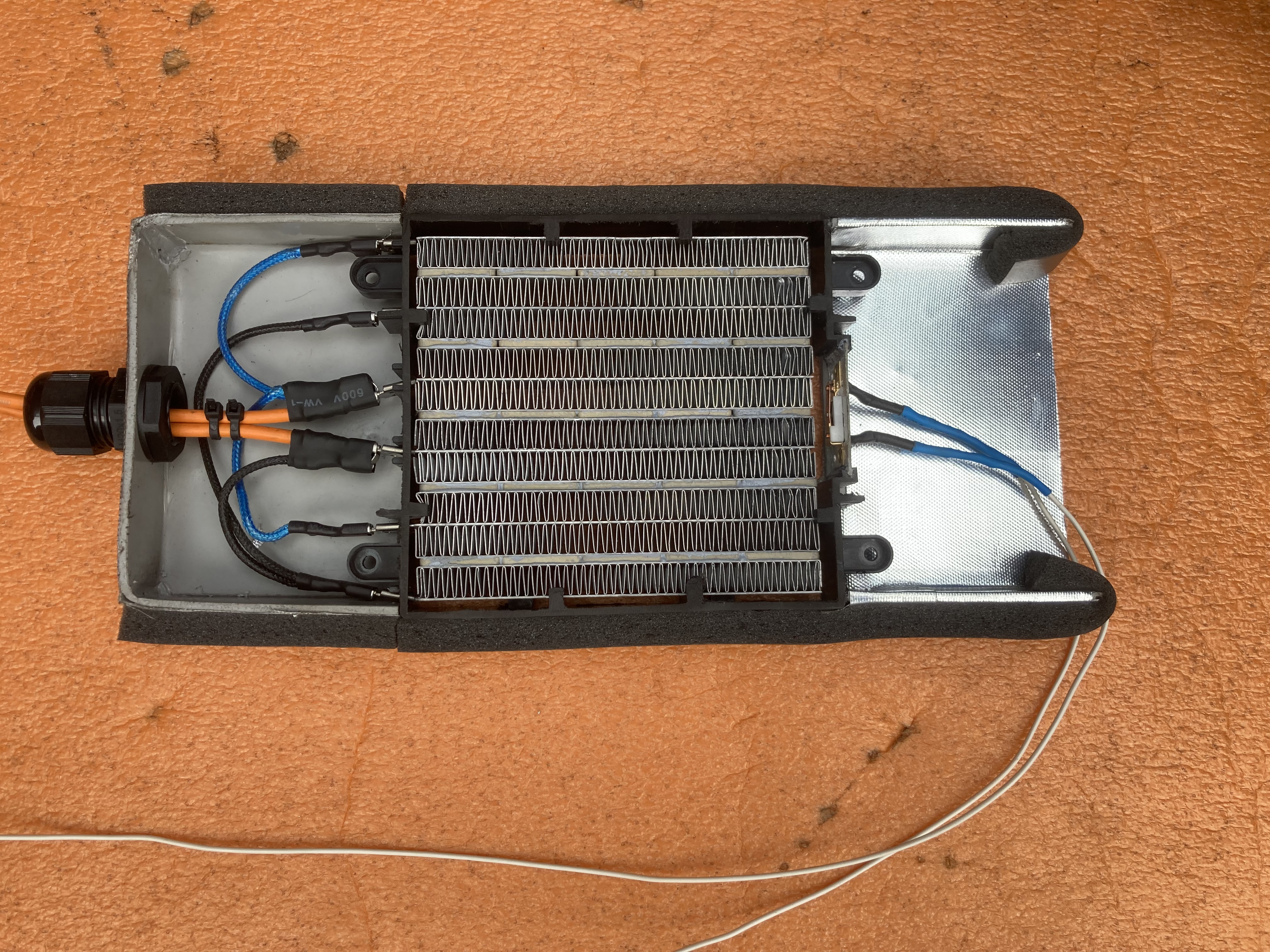 Very neat. Have you been able to test it yet?Ev8 wrote: ↑Mon Feb 27, 2023 7:03 pm So the day I remove my temporary cabin heater, (dishwasher heater and pump) temperature falls below freezing again, roll on quickly making its replacement, no time for a beautiful housing for the ptc element from a £30 240v heater so bent up some plastic in the metal folder with the help of a blowtorch and cover it in some heat reflective stuff I had around, contactor is mounted of the other side of the bulkhead inside the engine bay, all this in aid of freeing up room in the engine bay to locate the outlander changer to make room in the boot for the additional 3 bmw modules!