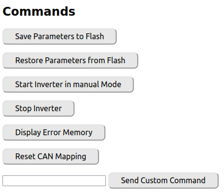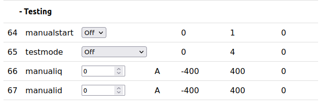 I'm thinking of adding another parameter, something like learnmode, to allow this. This should default to none on power up. Before going into manual mode this would need to be set to either testspin or learnldlq (if left at none manual mode would be disabled), then when manual mode was entered the inverter code would either slowly spin the motor or learn Ld and Lq. Other modes could be added in the future to add the other features. The reason I like this is it makes it difficult to accidentally get into manual mode as it effectively becomes a two step process.