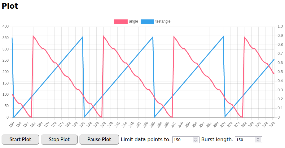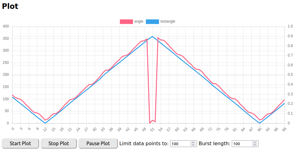 First up Resolver testing. To use you first go to the Testing section of Parameters in the web page: Change 'testmode' to 'Resolver' (note this parameter always defaults to off on power up): Then go to the commands section and hit 'Start Inverter in manual Mode': You should see this in the Messages section of the web interface: This will start sampling the resolver but without starting the PWM (so there is no power to the motor). The motor shaft can then be rotated while plotting the 'angle' parameter so see the result. You are looking for something like this: Now this is with the motor being turned in my notional forward direction but it can be seen that the angle is decreasing. To fix this swap the wires on either the sin or cos resolver connections to get: Final thing worth noting. If the motor and resolver pole pairs are both set to 1: Then this plot can be used to determine the resolver pole pairs. On the above plots you can see that a single rotation of the motor shaft gives three rotation on the plot so this resolver has 3 pole pairs.