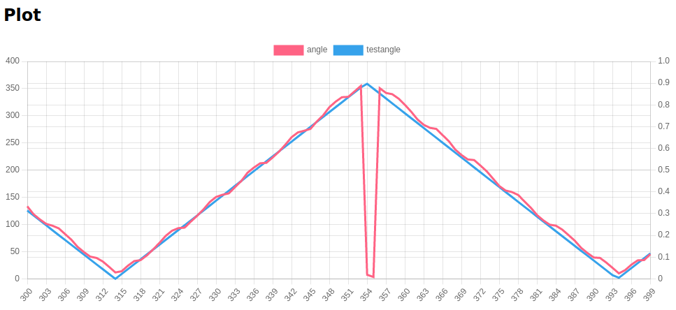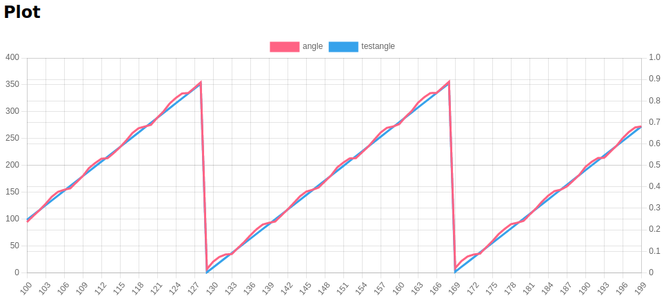 The motor should turn slowly and on plotting 'angle' and 'testangle' something like this should be seen: Now the thing to check on this plot is that the two plots move together, they clearly don't on this one and that is because the motor is actually spinning backwards! Swapping two of the motor phases and re-running gives: The plots are now moving together and are parallel to each other. If they are this is an indication that the ratio of motor poles to resolver poles is correct. If the resolver poles have already been set in the resolver step you can be confident that the motor poles value set is also right. If one trace is moving faster than the other adjust the motor poles till the pair move together.