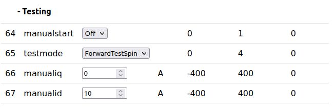 The first mode to use is ForwardTestSpin. It is selected in testmode as before, the value of Id to be used is set (10A seems a safe starting value): and then start the inverter in manual mode as before (note the inverter will continue to run in this mode until stopped using the Stop Inverter button).