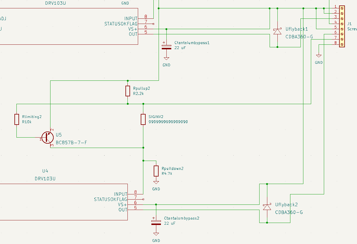 I'm not sure where that original box symbol came from but I believe it came up when I first added the transistor, so I just ran with it. Then I tried to swap it out for one that looks like the proper symbol and used "Transistor_BJT:BC857". The DRV103 footprint was downloaded from somewhere else, but I had to add the via in the middle. At the time I believed the one I was getting had a pad on the bottom for heat dissipation, but that turned out not to be the case. I just left the via in case anyone did have one with that feature.