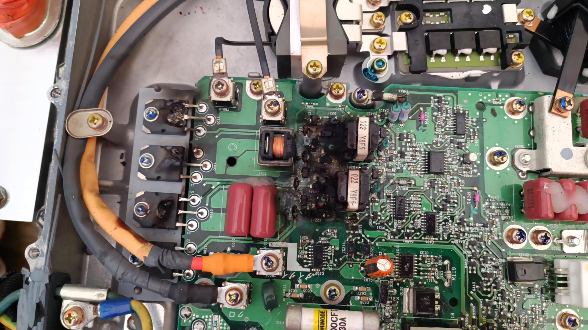 Ok, lets disconnect everything, drain the coolant and take the assembly out and open it: Oops. I think when I resetted the inverter while charging the DC/DC must have put full pack voltage (380V) on the DC/DC and apparently it doesn't like that. The damage then showed later.