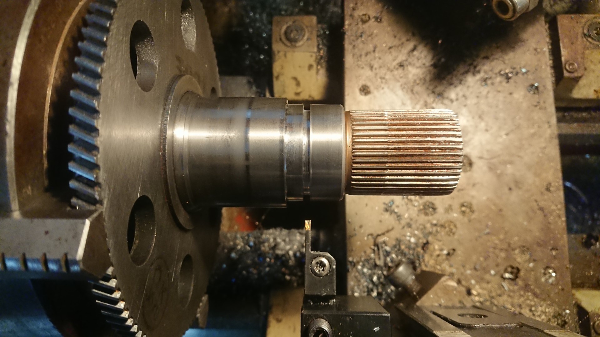 The gearbox output shaft gets a retaining round cir-clip groove before being cut to length and chamfered for a final weld