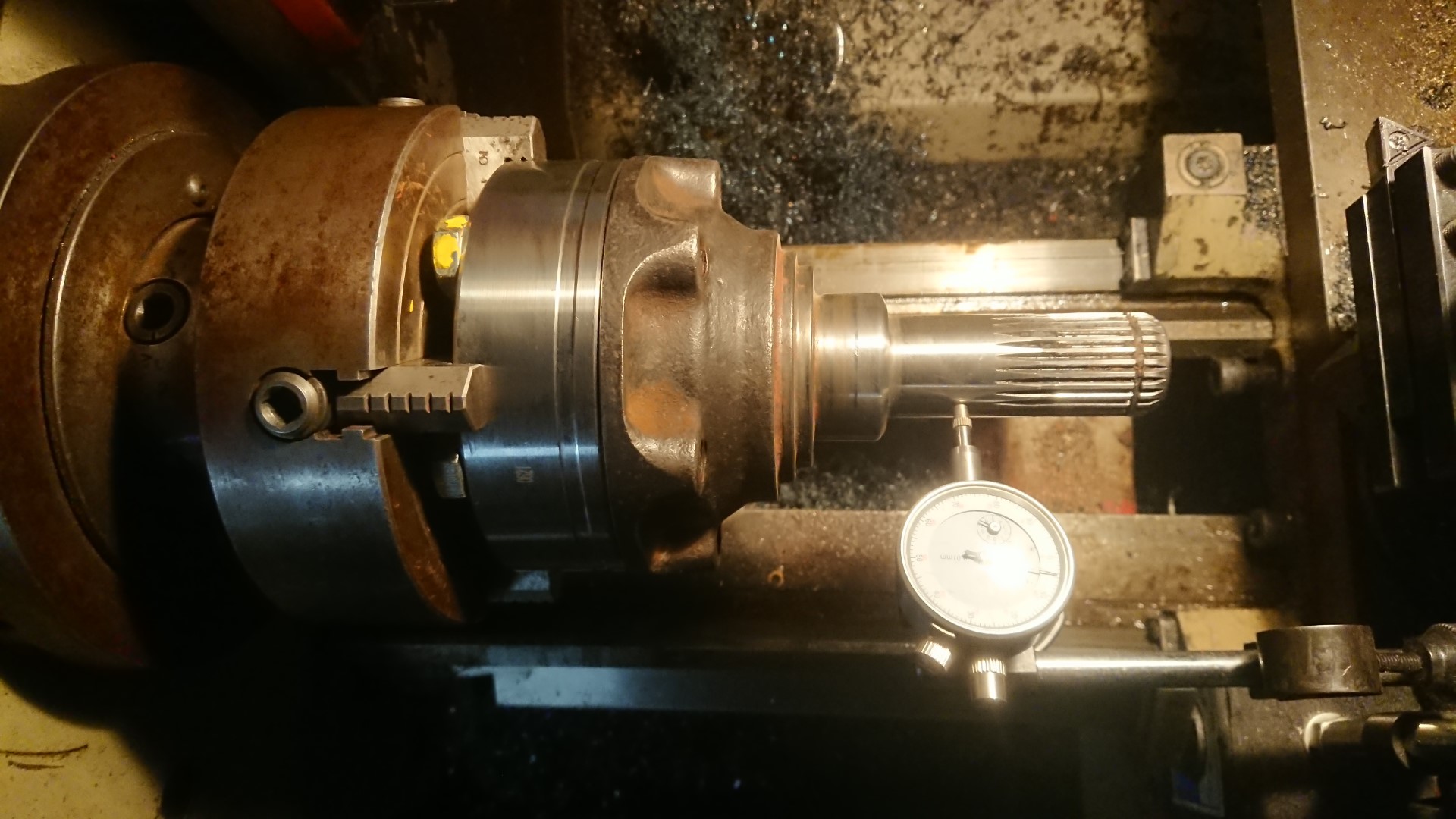 Where I think the previous version tried to use the CV cup spline shaft in the lathe as a datum, I'm trying to use the CV itself to give it the best chance of alignment. CV gets set up with the dial gauge first and then the CV flange bolts on and more dial gauge checks