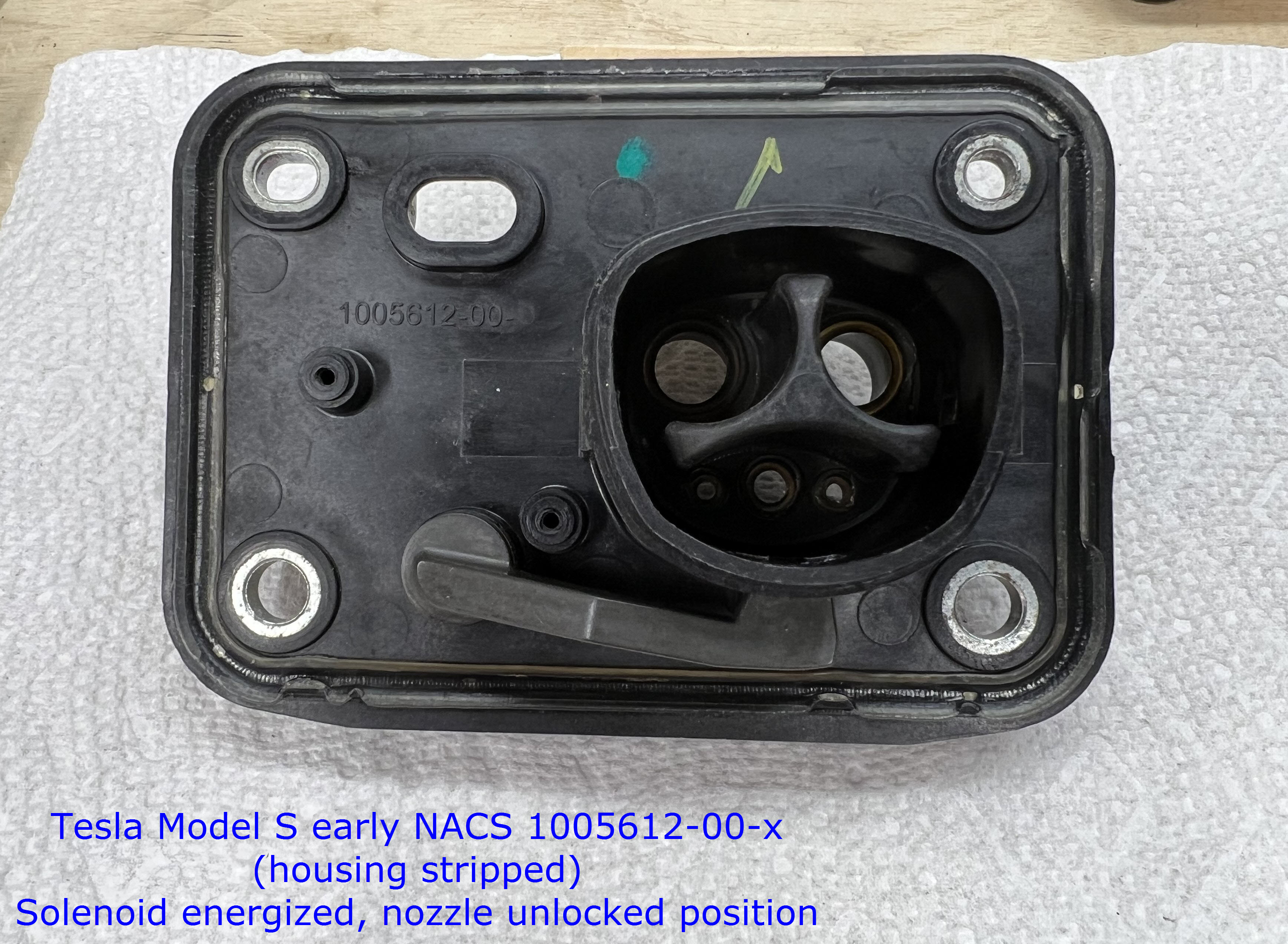 Tesla early Model S charge port rear, with all wiring removed.