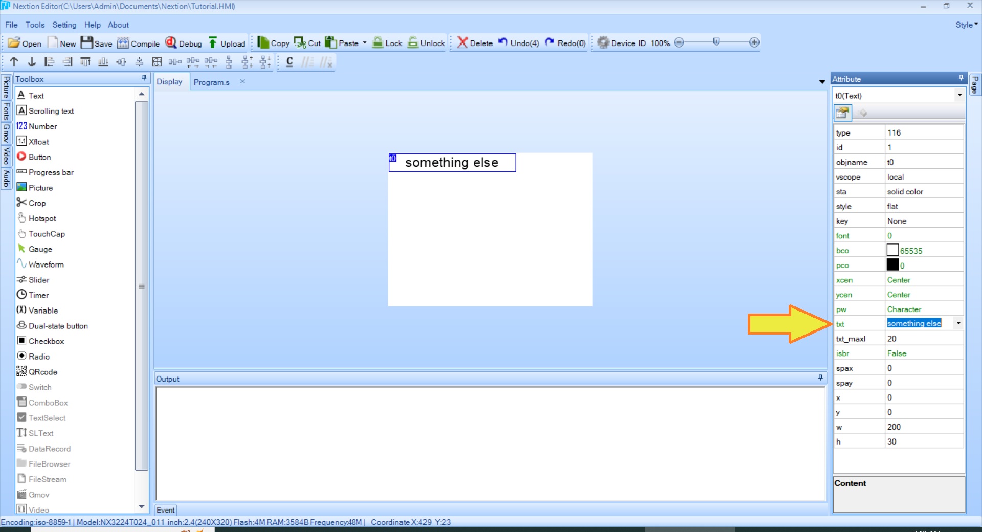 what's important to note, is the Name of this object aka objname=t0 this is what we will need when we write the Arduino code (sketch) for the VCU if we want to manipulate aka change this textbox