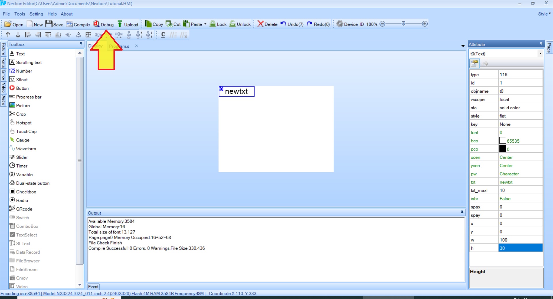 Alright keeping it simple, that's all we need for demonstration purposes, just one text box and one number box. However all we done did so far is created an output design on our computers, great! now how do we get that to the actual little Nextion device?