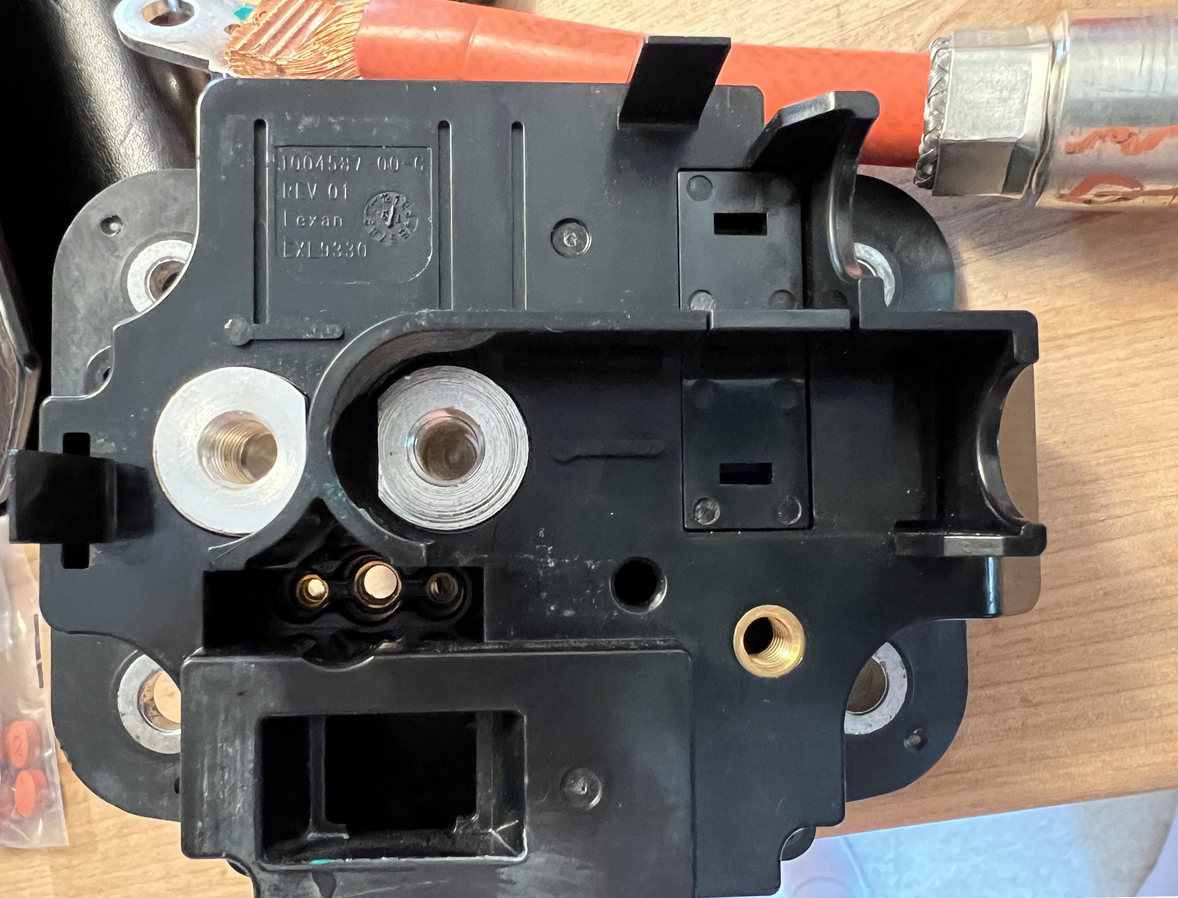 Tesla early Model S charge port rear, with all wiring removed and generic power lugs overlaid.