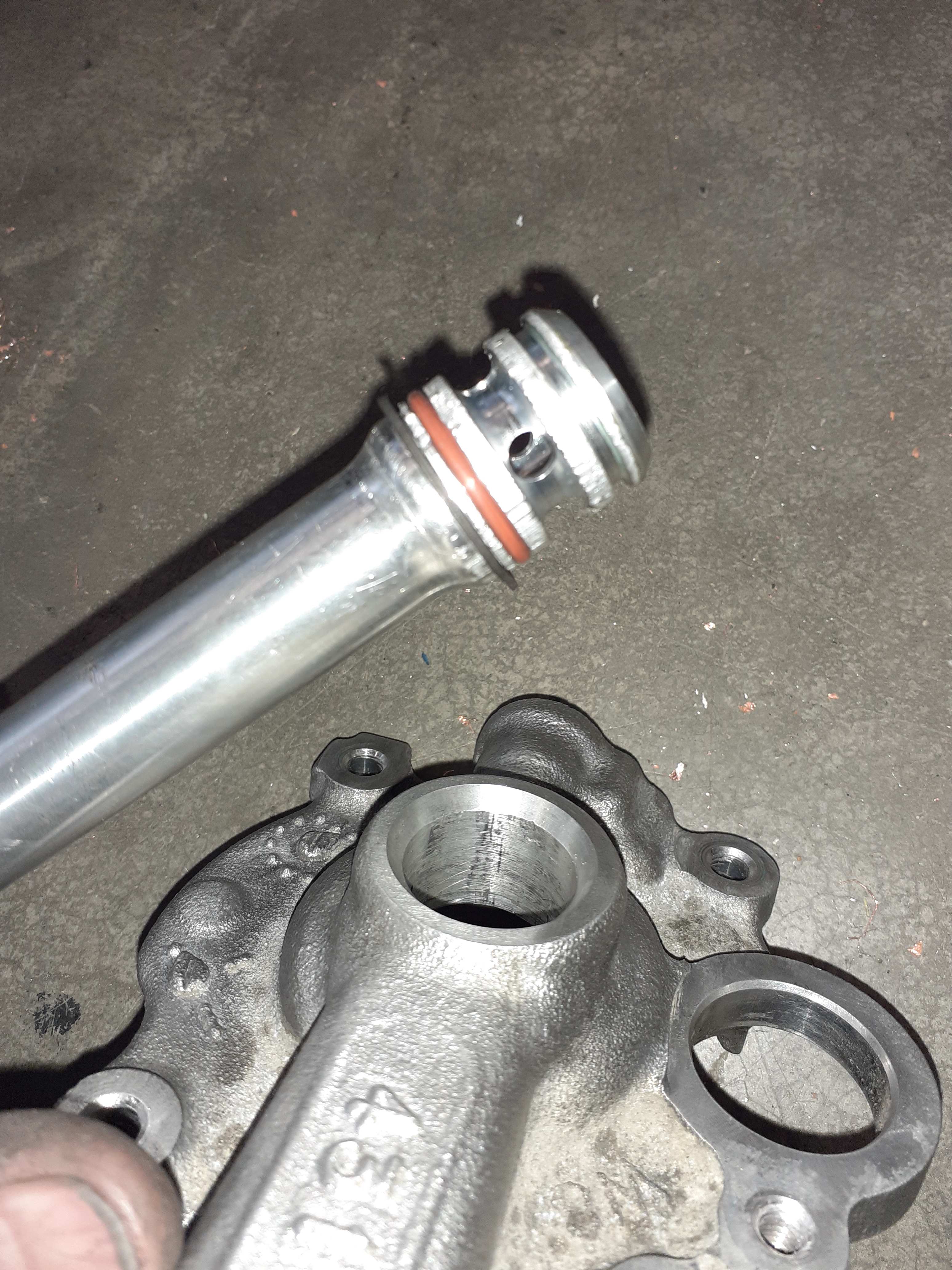 - Custom cap to insert into coolant seal bore to close off the chamber, cap shaped to avoid touching rotor shaft and provide enough gap to let coolant flow into the closed off chamber and exit top of the manifold.