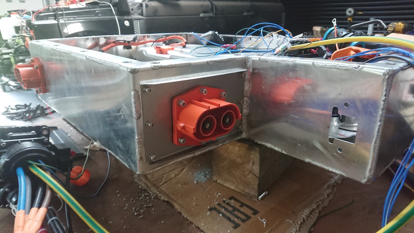 The high voltage junction box in the engine bay will house the Tesla Model 3 PCS (AC and DC charger and DC-DC unit), as well as connecting the battery to the inverter and charging interfaces, which means more connectors
