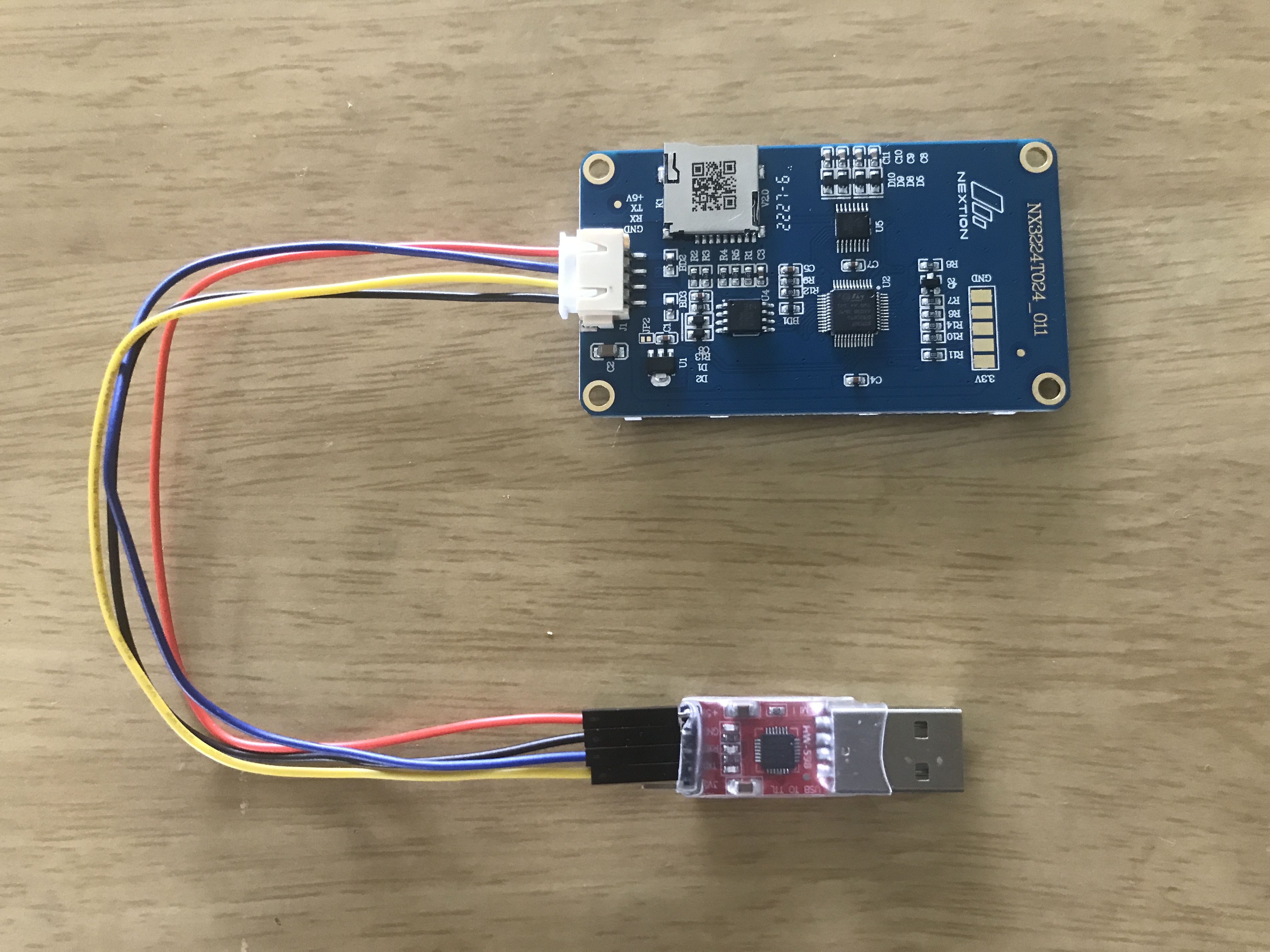so after the drivers are installed you can physically connect the four Dupont like wires to the CP2102 adapter, it's pretty straight forward, just remember that the Tx goes to the Rx and the Rx goes to the Tx, that little red thingie is labeled as is the Nextion side