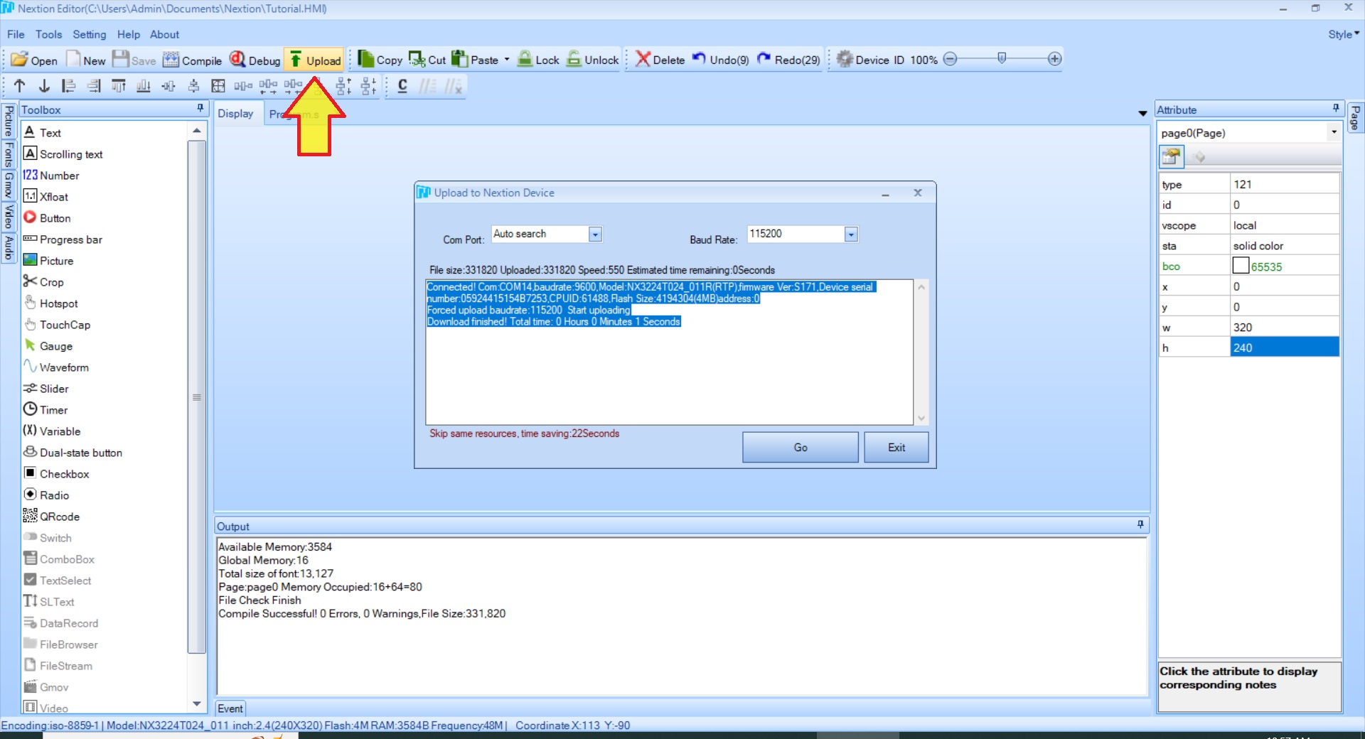 OK, now that we are tethered to the PC instead of clicking on File \ TFT File output, we will click on the Upload button on the menu, leave everything as is aka Com Port: Auto Search, cross our fingers and simply click Go... and watch the magic happen, and that's it that's the other way of saving that TFT file to the Nextion display, so you do you