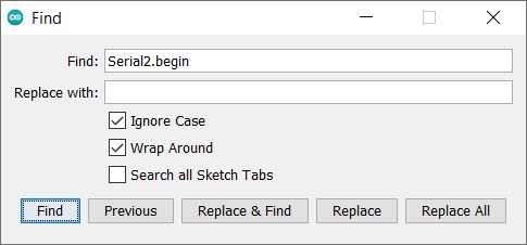 this means the first thing we need to do is search for a line of code that has this string in it: "Serial2.begin" and change the baud rate in it to 9600, it may look something like this: