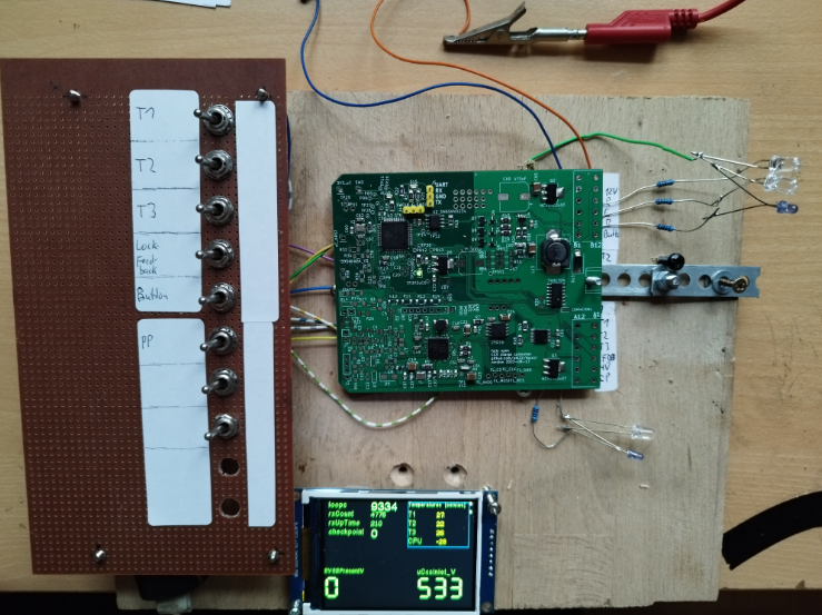 Some progress here: To ensure that the units which I plan to ship will work as intended, I'm creating a little test bench. The main point is solder-less contacting, without the need of the Deutsch connector. I use standard quare pins, stuck in wood, and a knee lever to get sidewards pressure on these pins. Adding some switches to simulate temperatures, button, PP and so on. Some LEDs to show the state of the outputs, and a small display (https://github.com/uhi22/TFT-with-CAN) to show some measurements from CAN. Also will connect the CP to my EVSE-playground (which uses homeplug modem and pyPLC).