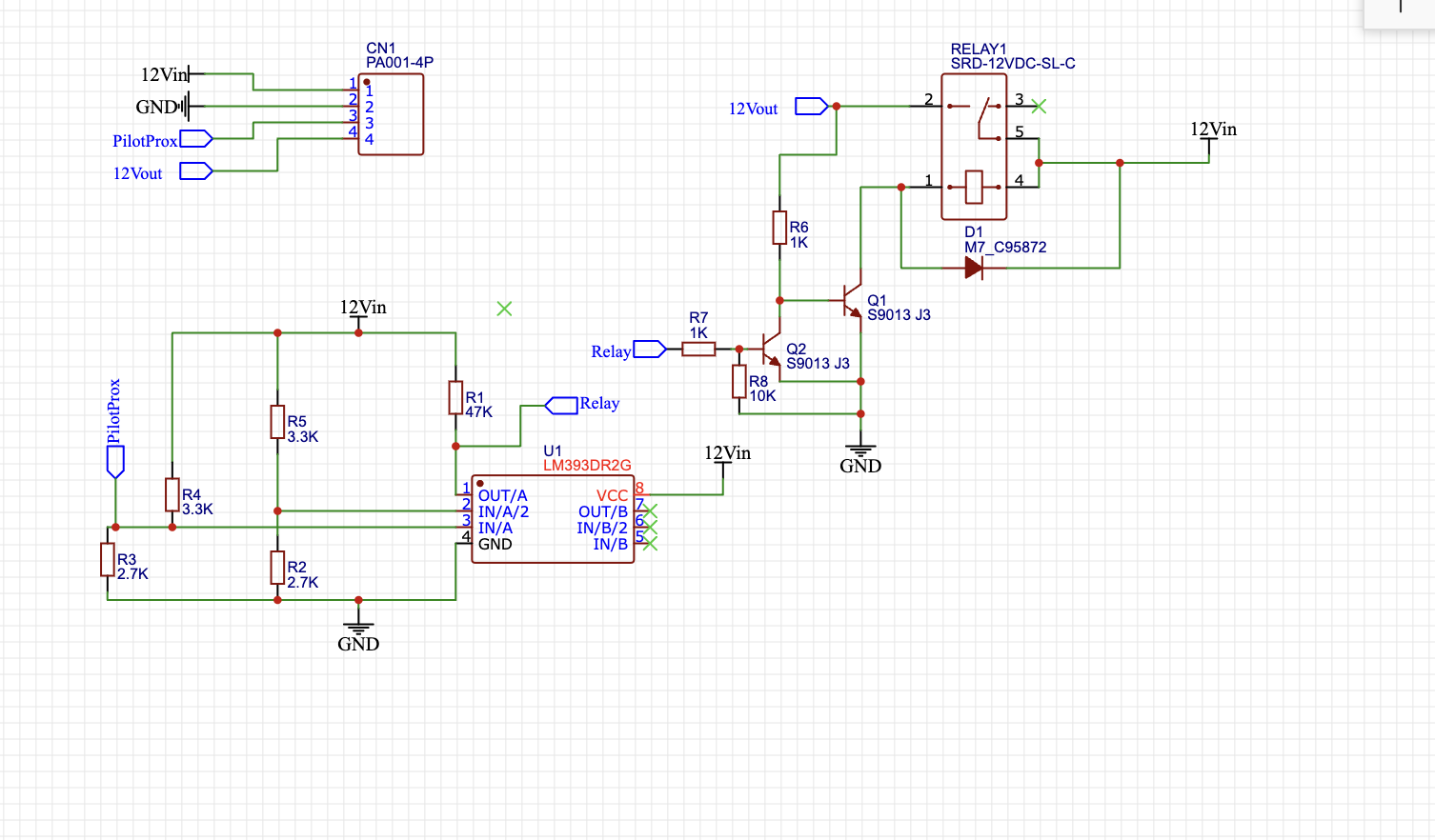 So after a bit of messing about I came up with a circuit that works well enough to turn on the relays when the charger plug is inserted and turn off the relays when the catch is pressed on the J1772 handle so that I can't pull the handle out with the current still flowing.