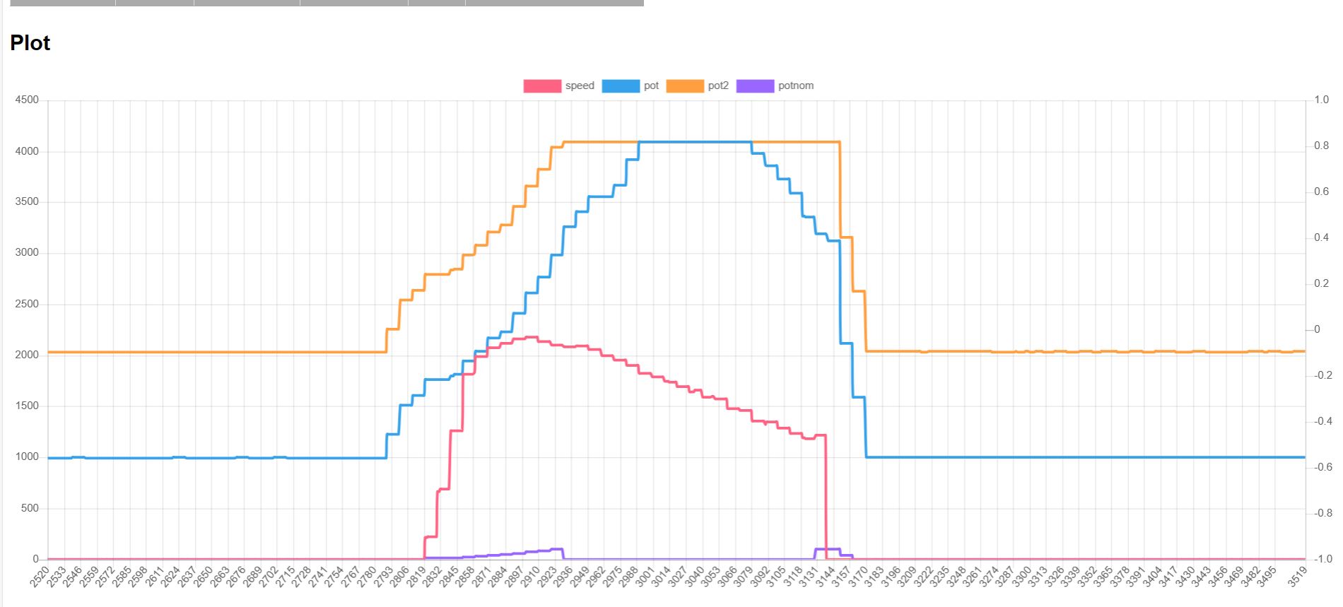 Yes, throttle goes out of range. You have set potmax=3000 where in reality it reaches 4095. Same with pot2.
