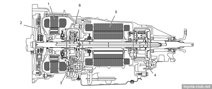 1 - motor-generator MG1, 2 - damper, 3 - mechanical oil pump, 4 - motor speed reduction planetary gear, 5 - motor-generator MG2, 6 - power split planetary gear (PSD)