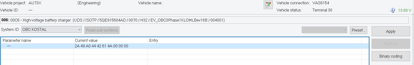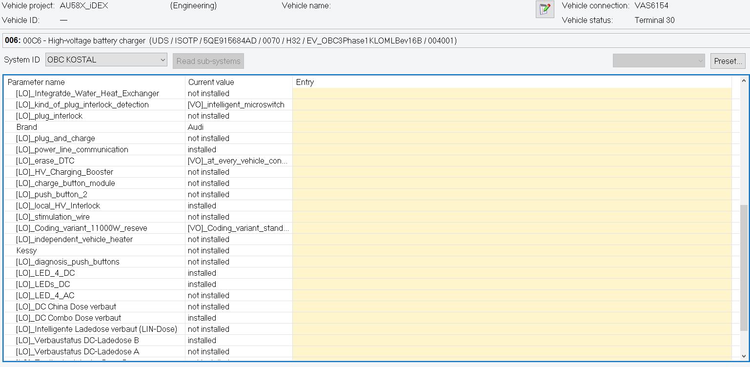 evMacGyver wrote: Sun Feb 11, 2024 5:36 pm Started to investigate 684J 11kW charger. Used lcode but to code using vcds security code is needed so that was no go. Need to get some odis compatible adapter next, I think.