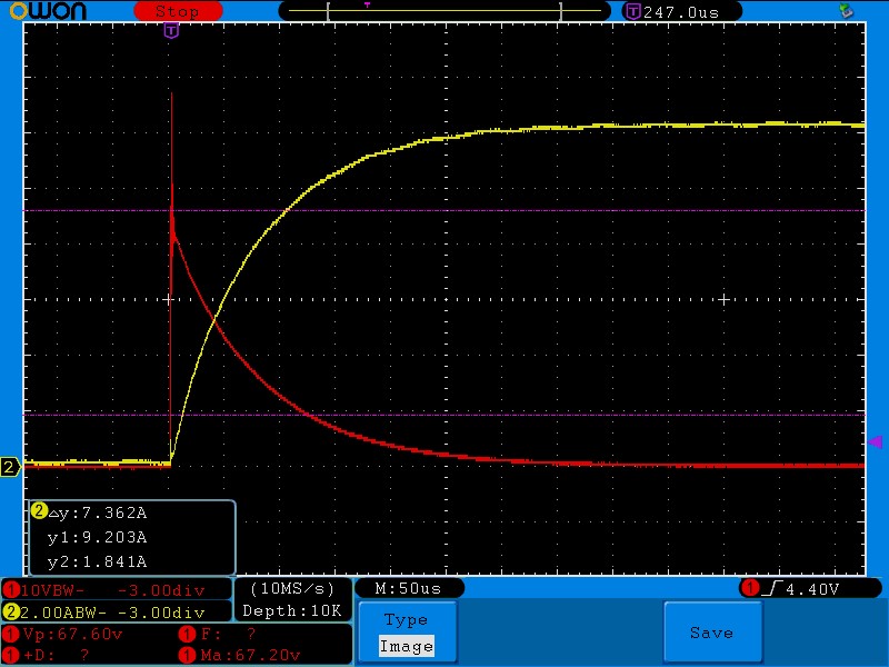 This time it takes a bit longer to get to 7.8A, 150us