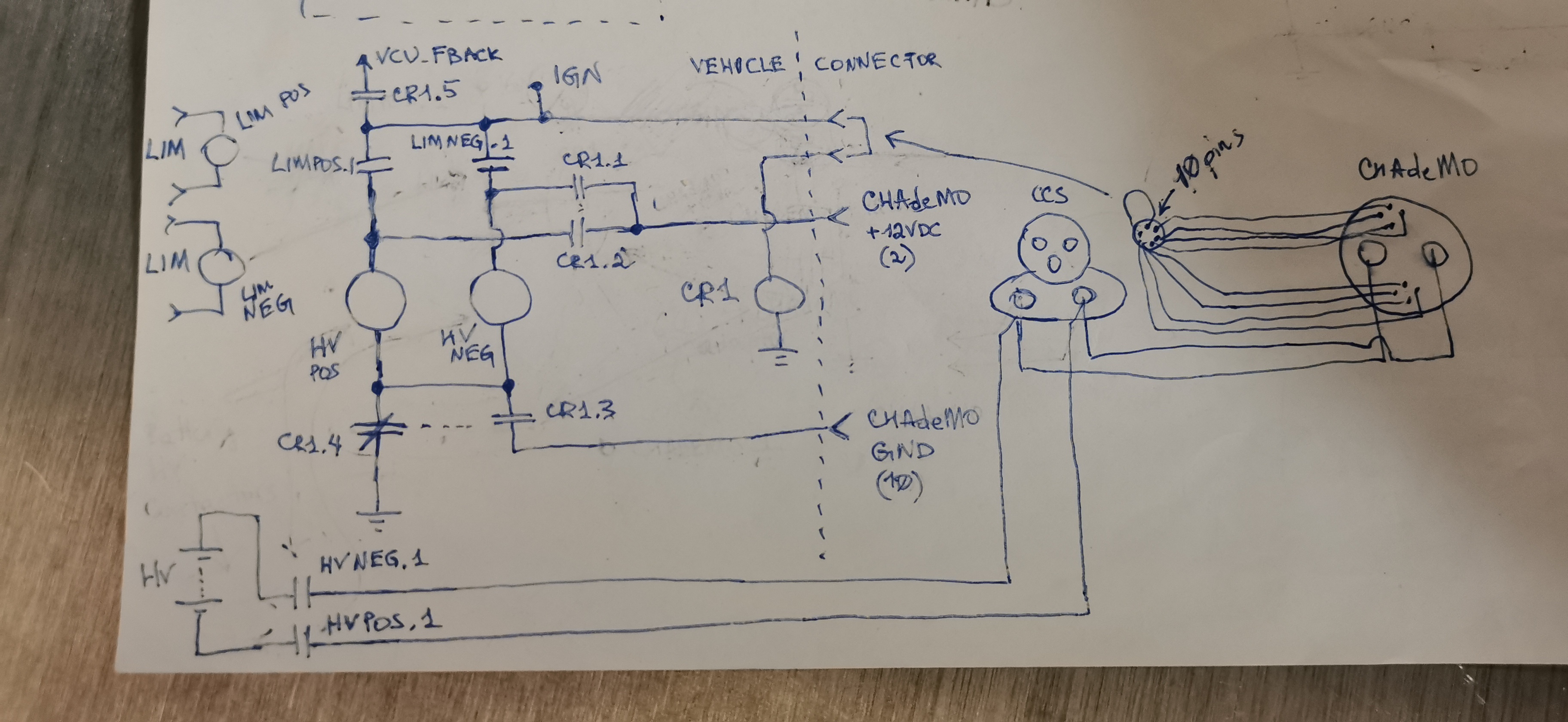 In essence, the HV wires will go from the EVSE CHAdeMO port to the vehicle CCS port, to the battery via big HV contactors (HVPOS and HVNEG). CHAdeMO comm wires will loom into a small 10 pin connector. The 10pin connector will also have a jumper, so that when it's plugged in, a relay (CR1) in the vehicle will switch from powering the big HV contactors in the battery box from the LIM (by default) to from EVSE (+12VDC via CR1.1 and CR1.2, ground via CR1.3 and CR1.4). The rest of the CHAdeMO comms and the control relay feedback (CR1.5) will go to VCU for monitor and control. The VCU will be handling all the comms.