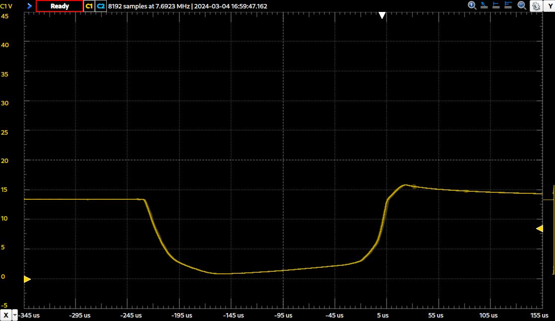 I reckon the inductor had entered saturation because of the low frequency. Dialed back to 10% or 470 mA: Looks better, but the edges really aren't very steep. Tempted to say we disallow economizing completely with the NCV8402 variants