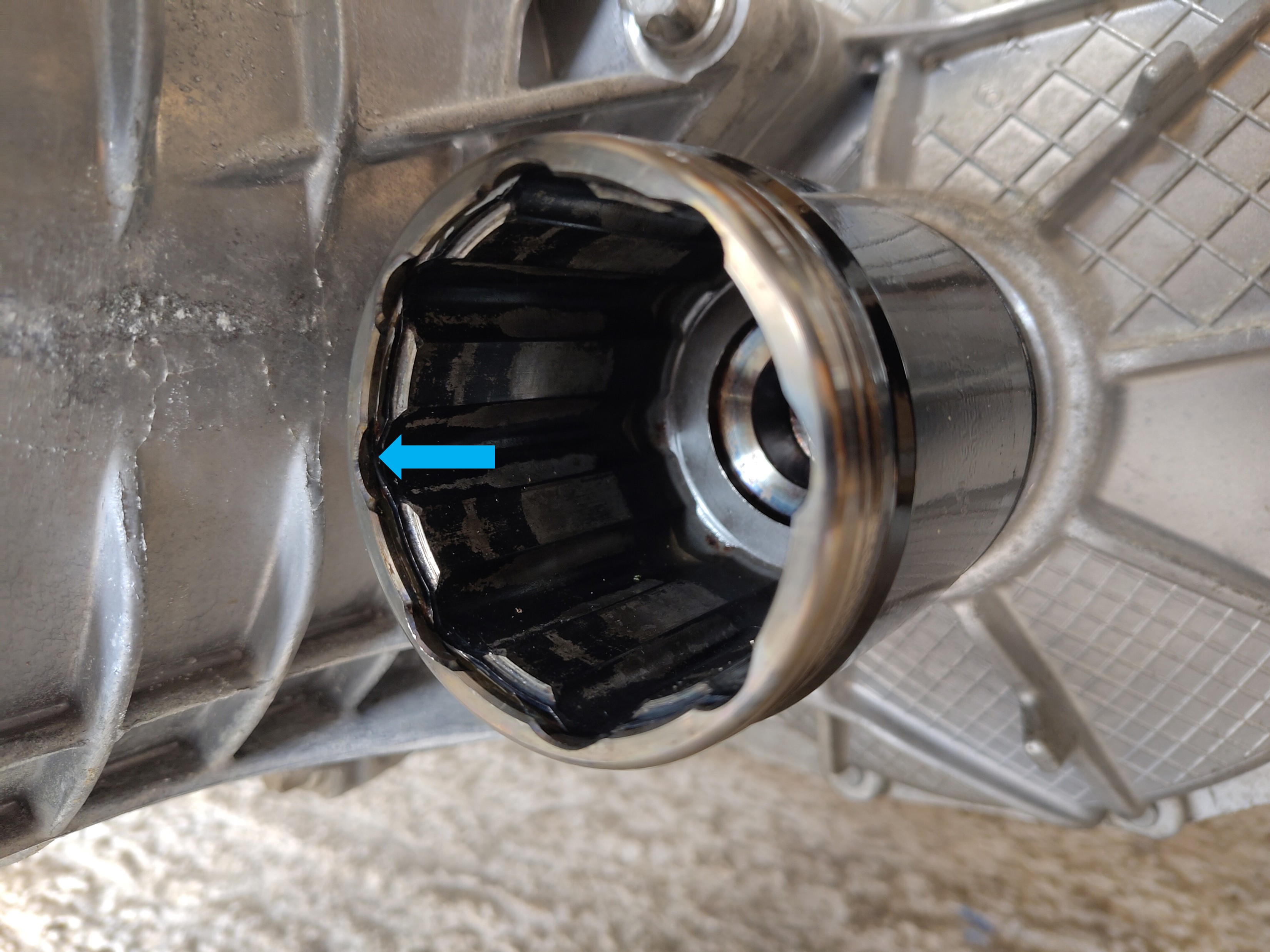 A bit off-topic from BMW i3 inverters, but for anyone needing to take the inner CV joints on the i3 motor apart, the cage, inner race, and balls are retained by an internal snap ring that runs around the inside lip of the housing, indicated by the arrow on the image below. Easily removed with a small flathead screwdriver.