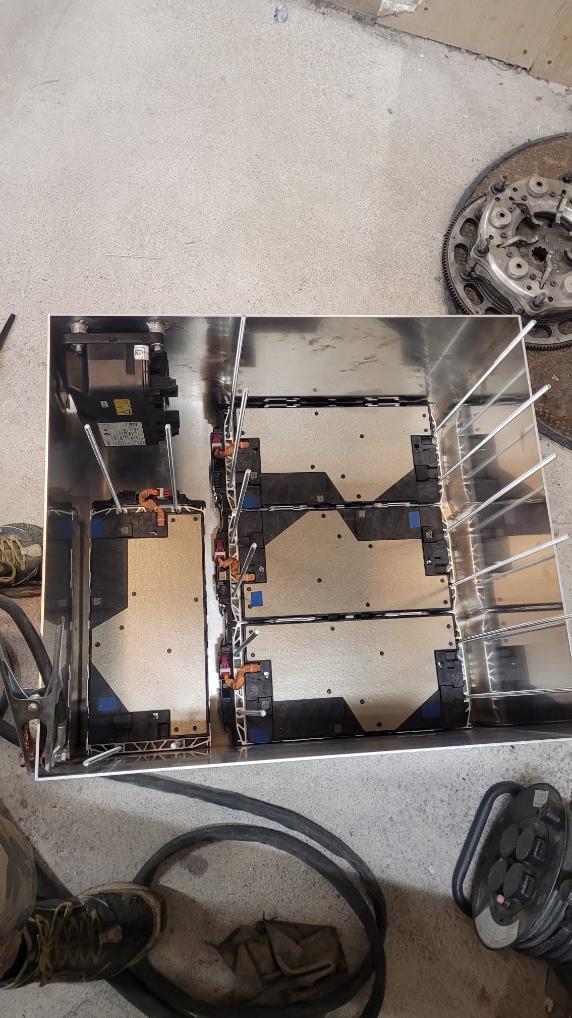 Battery box in works. 12 of these X5 modules will fit in engine bay, including safetybox. 3 levels of 4 batteries. Each level will have its own aluminum plate to help heat exchange.