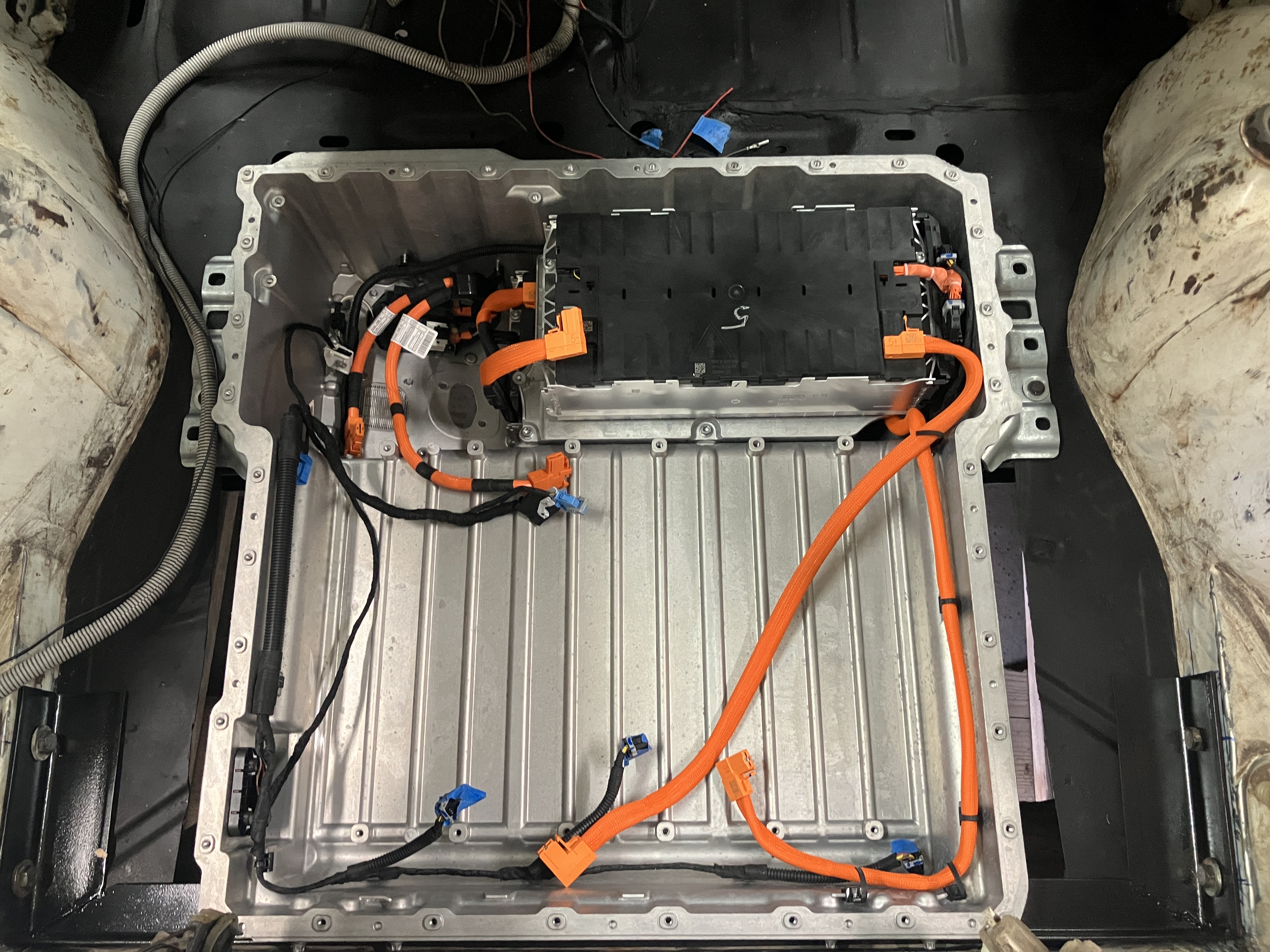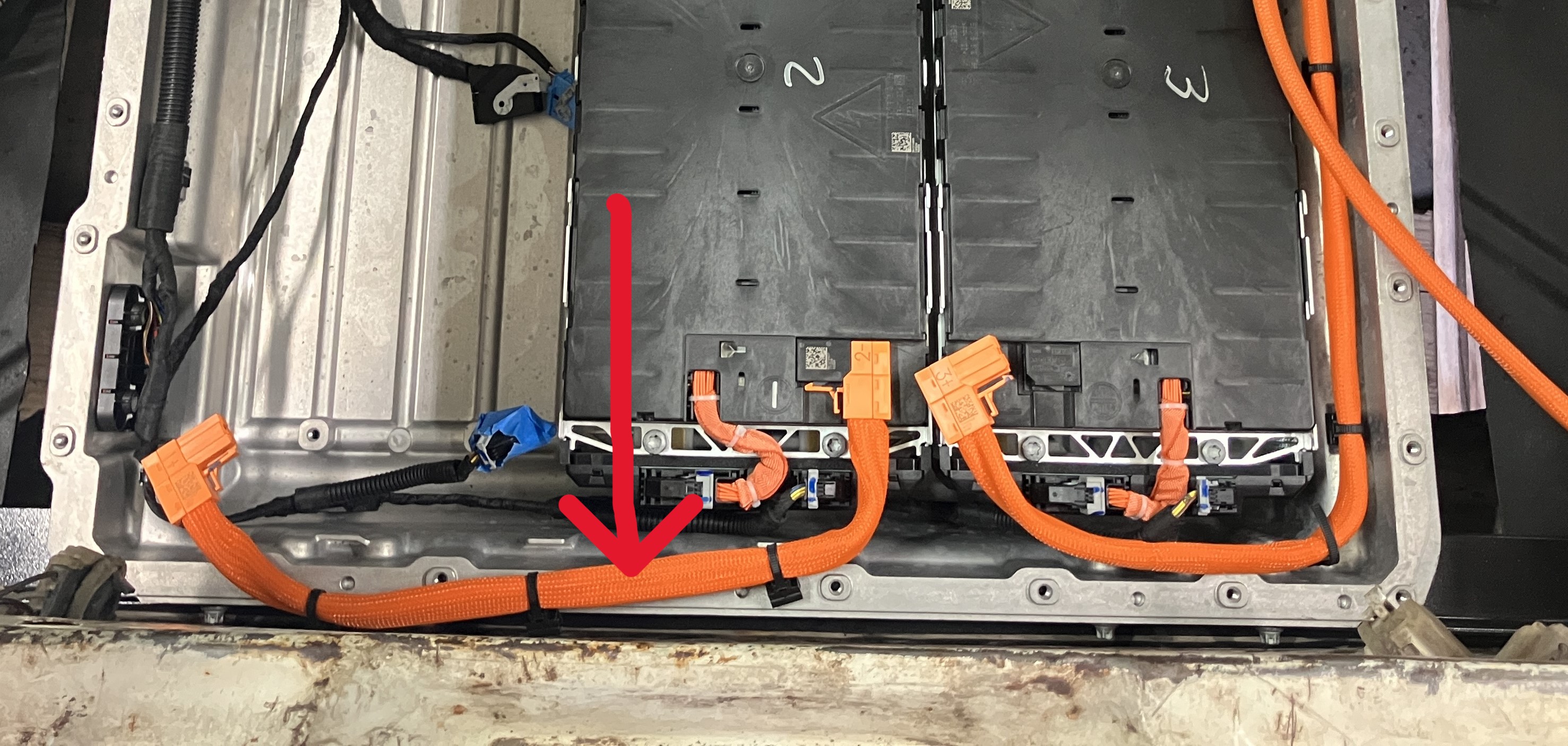 unplastification of the stock OEM BMW 530e battery pack high voltage orange cable to something something was next, I honestly have no idea what this ran to in it's stock configuration but in our case it will run to the Prius inverter