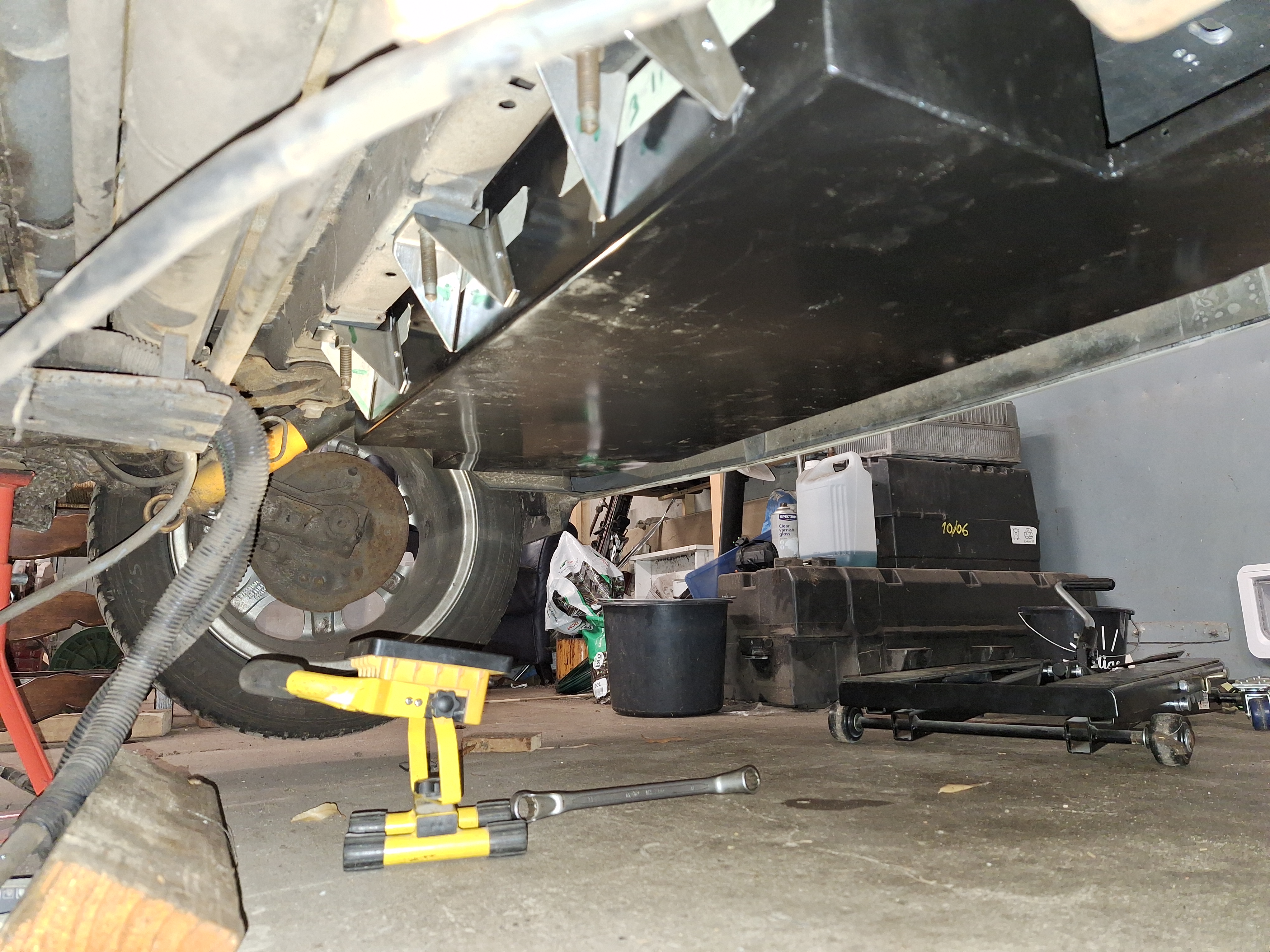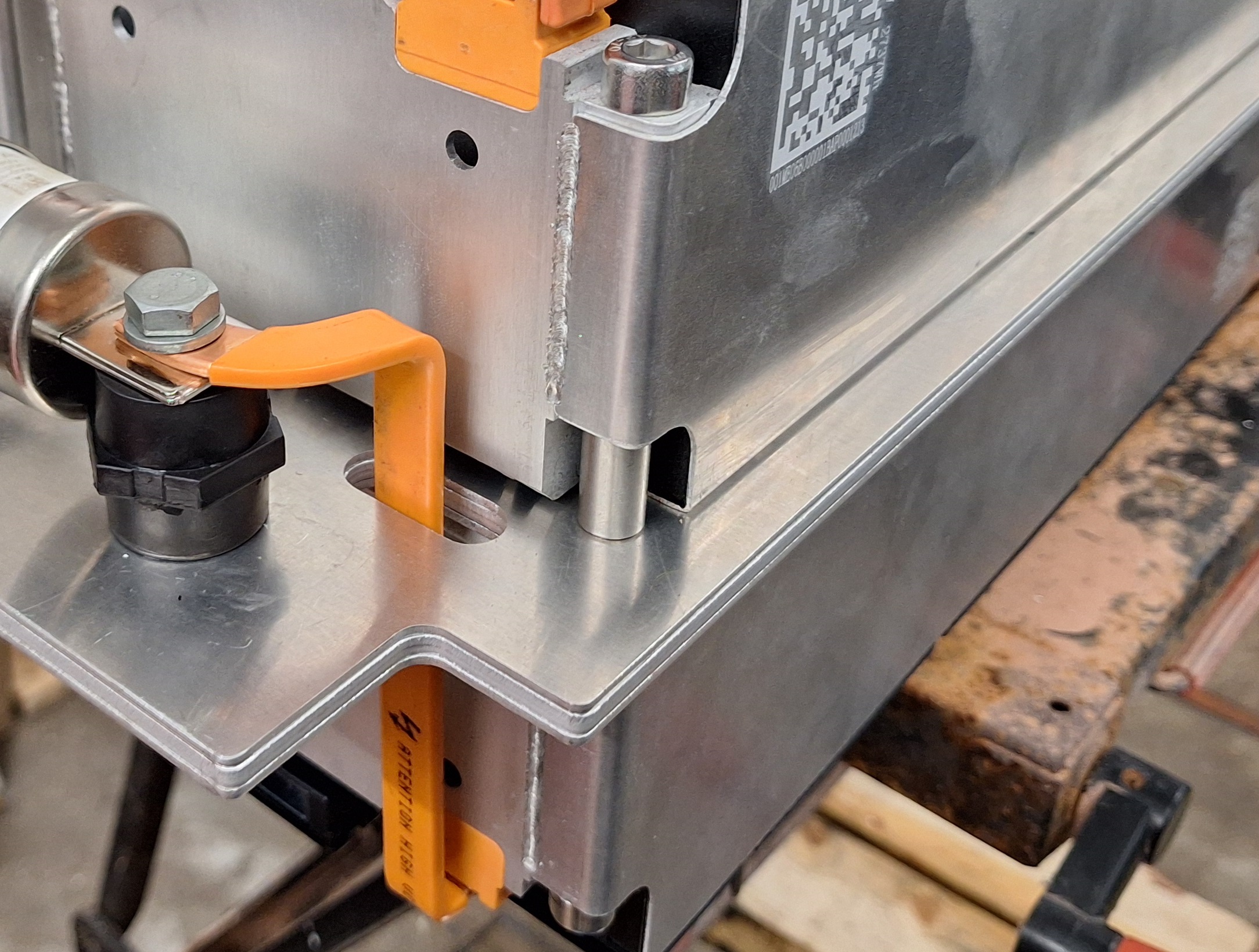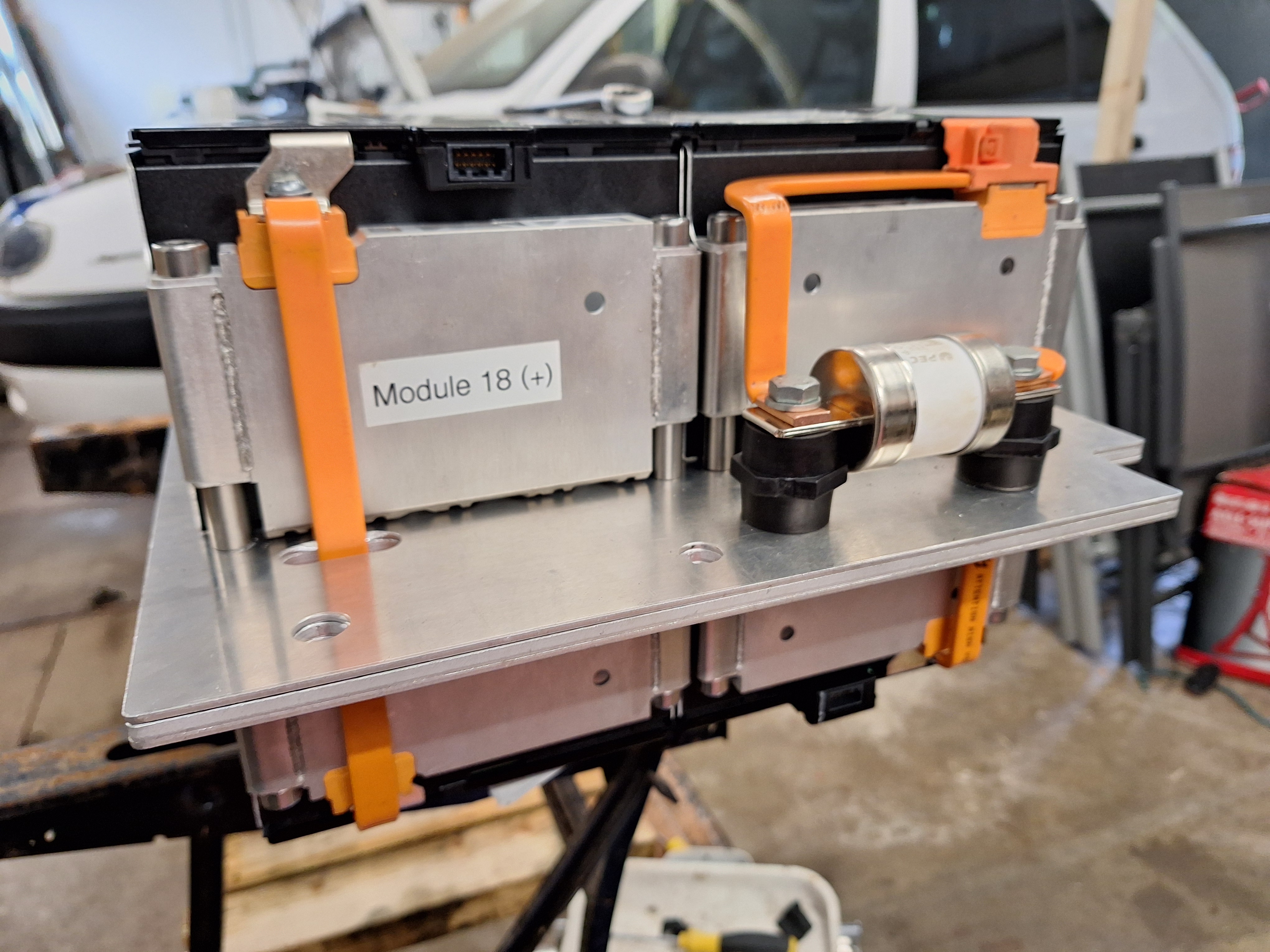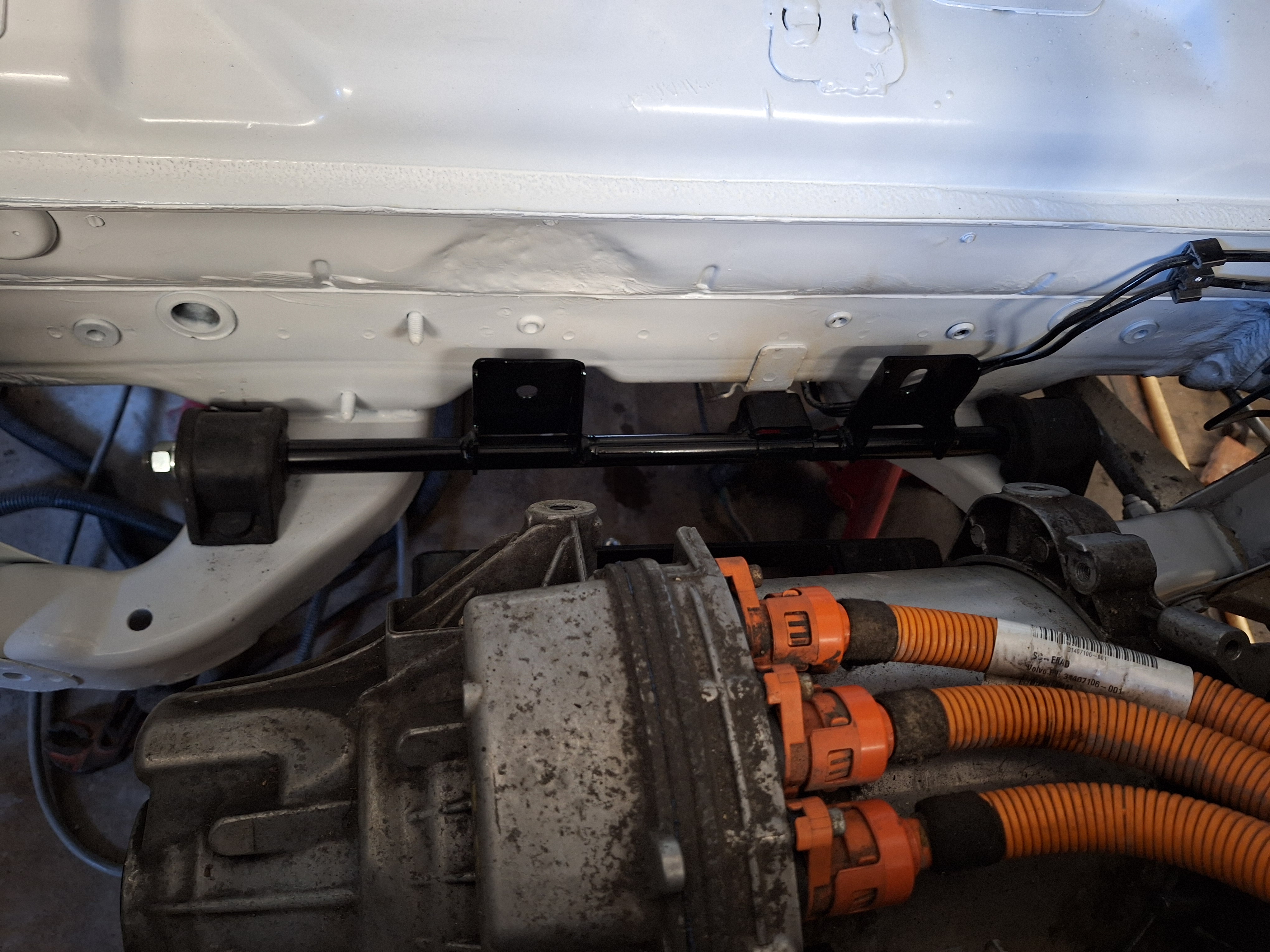 Made brackets to mount the charger. It clamps to the cross brace, did not want to mount this permanent because I like to get a 11kw charger.