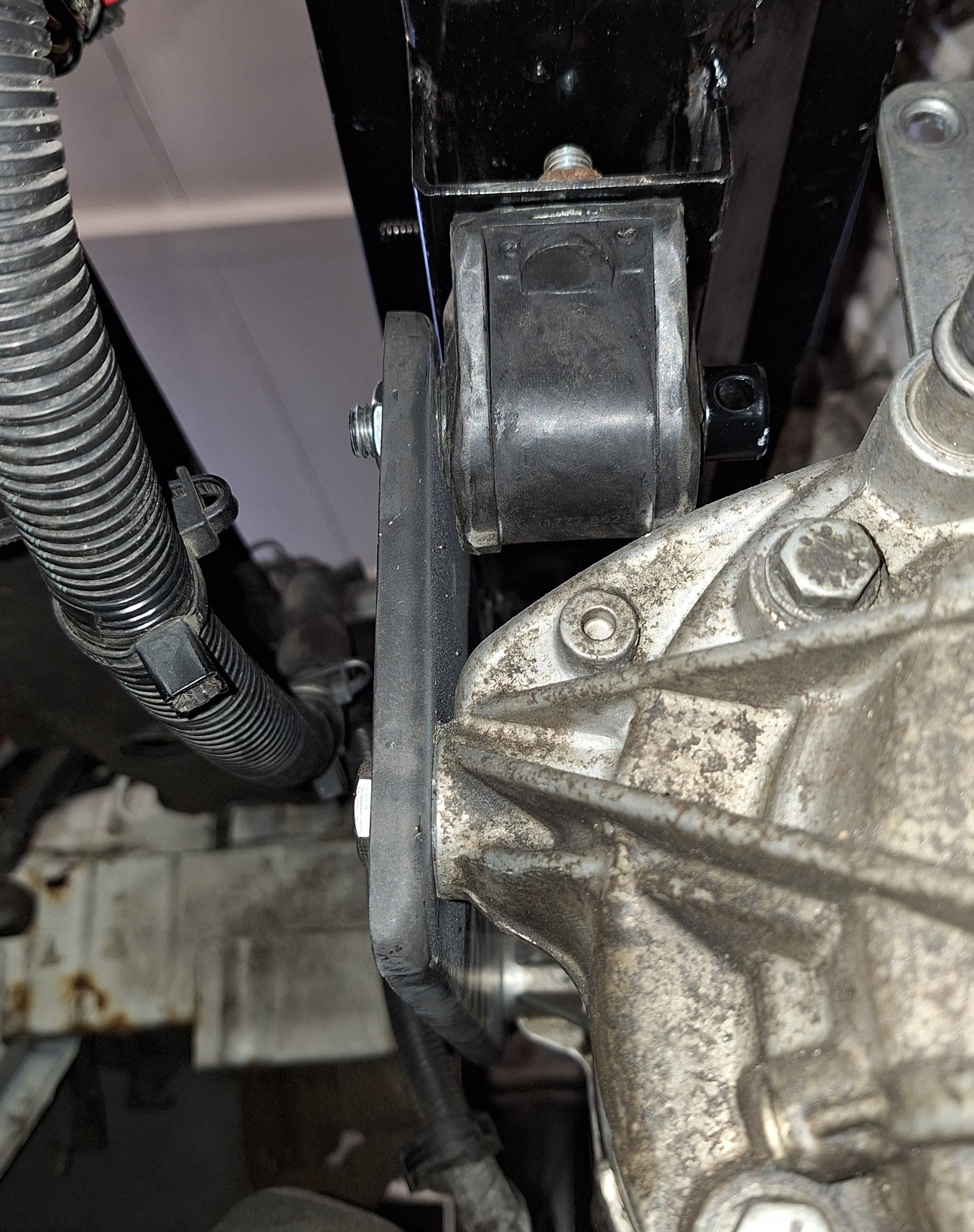 On the front of the motor another two lower control arm rubbers are mounted to the cross brace. Made a plate to mount the motor to the rubbers. The lower control arm rubbers have a 17mm bore that is not a standard bolt size so a made a set of bolts on the lathe with a M12 on the end.