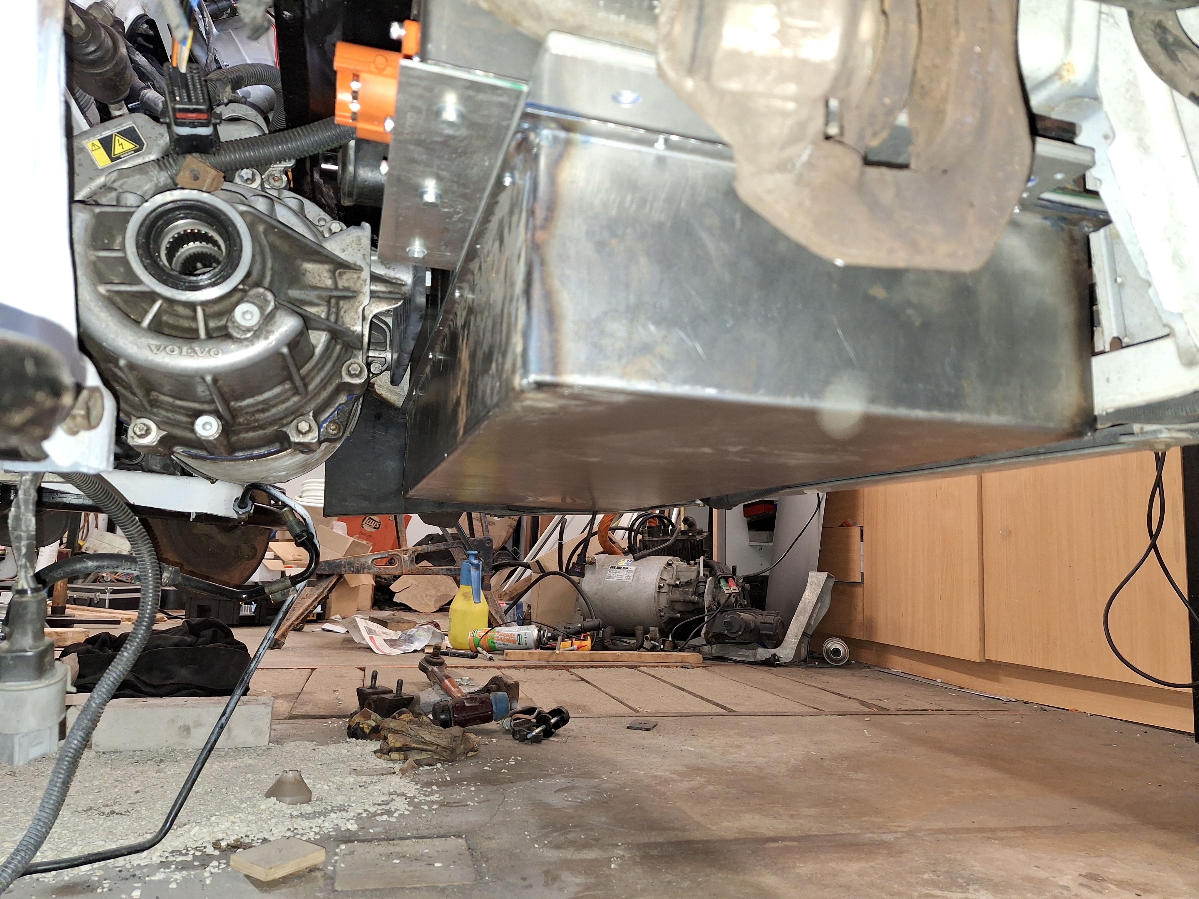 First removed the motor, inverter, vacuumpomp, driveshafts, battery boxes, electronics box, 12V battery and the heater.