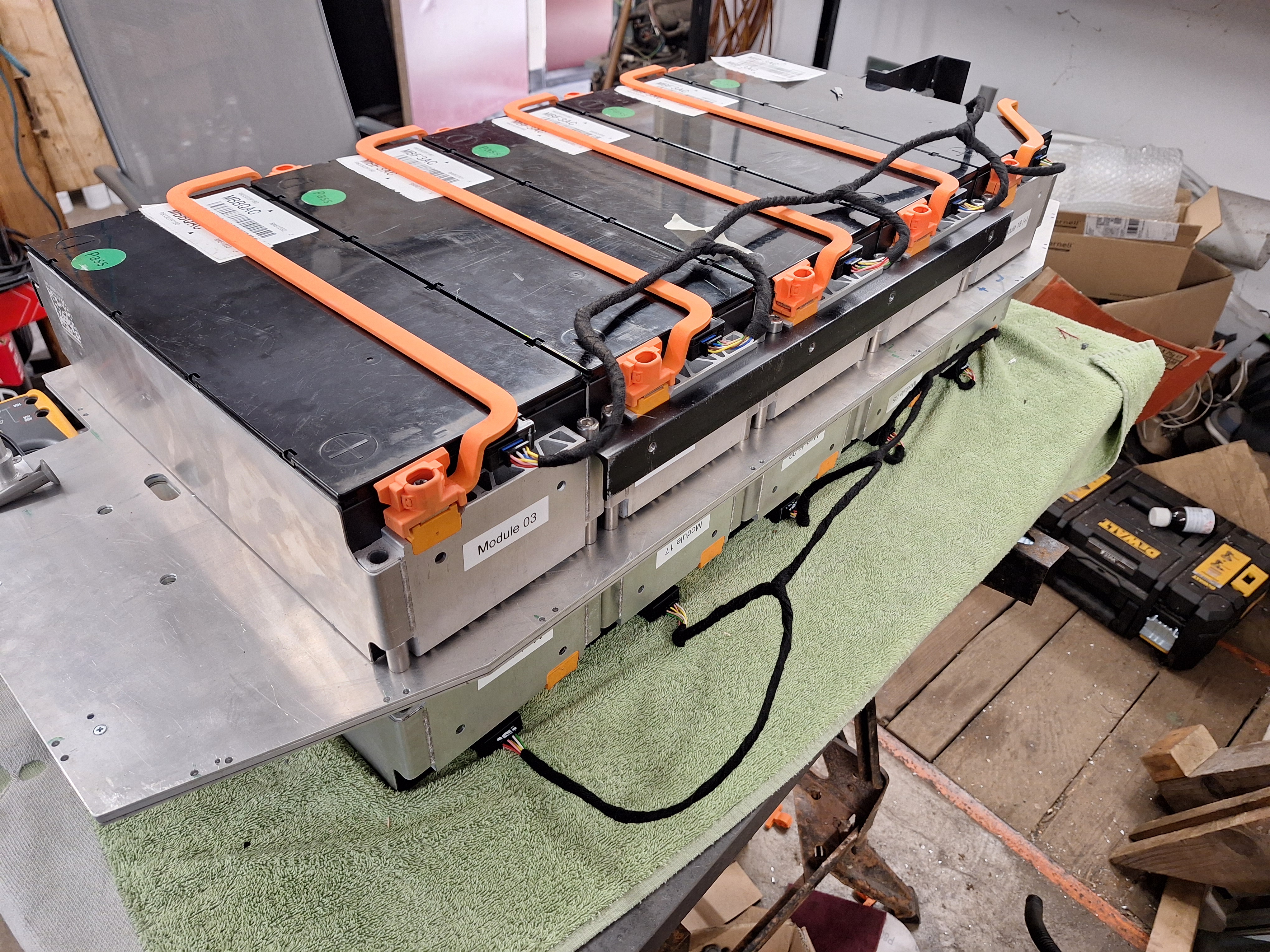 Because of space constandes all the modules in the back battery box have to face the same way because of the connectors for the bms wiring. I made 8 busbars from new copper bar to connect the modules. After bending them I covered them with heatsink. Most of the smaller busbars I made by reusing busbars from the e208 pack.