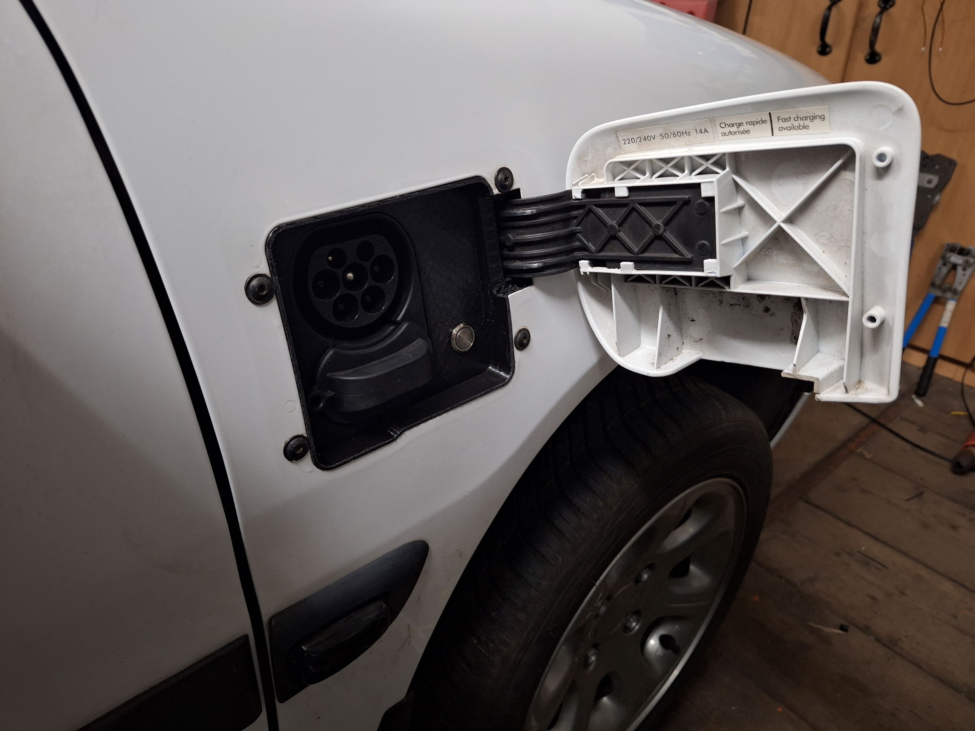 With the help of a friend designed a replacement insert for the charging port. After a lot of back and forth we got a 3D print that fit the complex shape of the fender. After this I had to mount the ccs port to the car. First I bolted the fender back on the car. Then held a piece from the charge port inplace and glued it to the car.