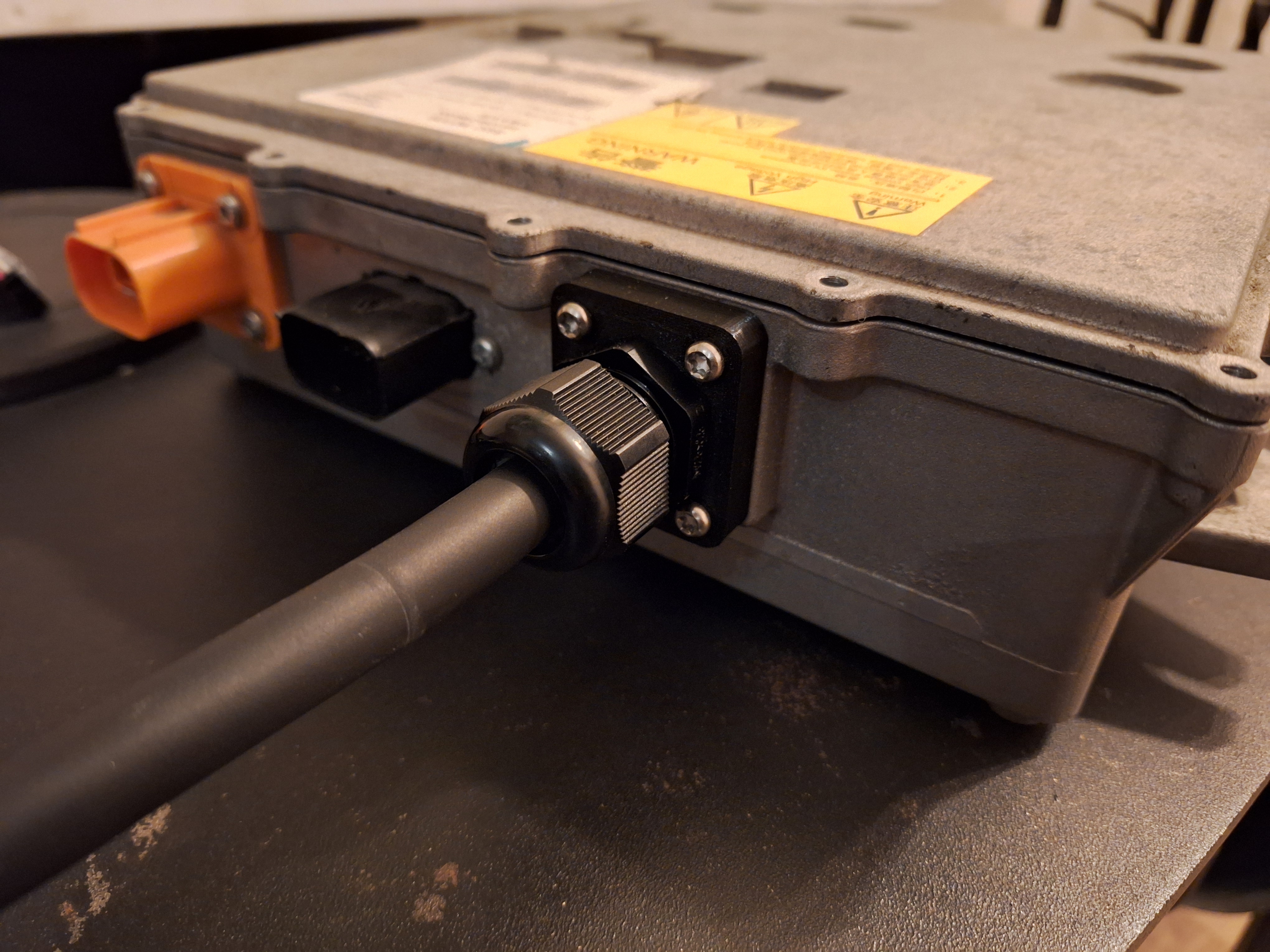 My charger came from a crashed car and the AC connector was broken. So I designed a adapter plate to mount a cable gland. Available on the wikihttps://openinverter.org/wiki/Mechanica ... n_database