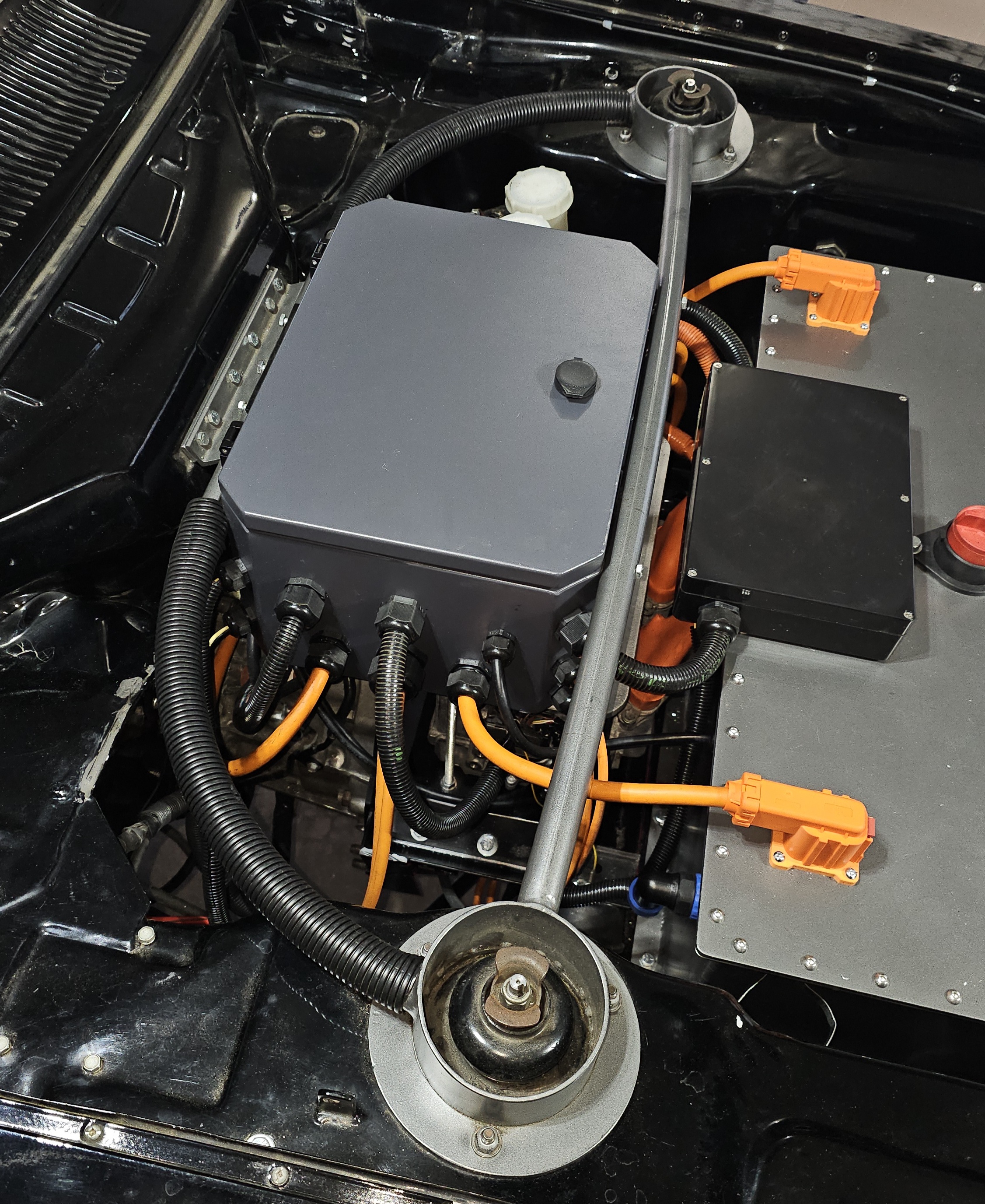 The first attempt was to mount the inverter in-between the motor mounts down low, but it was too tight, so it's probs gonna live on the upper floor, might put the DcDc underneath.