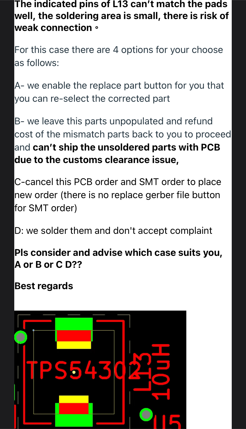 Landsi wrote: Wed Jul 10, 2024 8:23 pm JLCPCB was picky about the footprint of L13 - see image. They would have placed it, but “without right to complain”