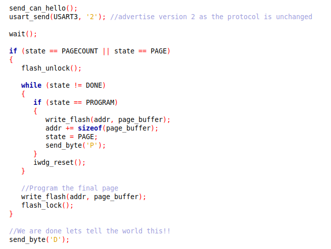 As I write my client I'm trying to document the protocol and write tests to exercise it. I realise you are pushed for flash space so need to take a few short cuts. My ultimate aim is to write a C2000 MCU bootloader for the Tesla M3 DU where we have 2MiB of flash space...