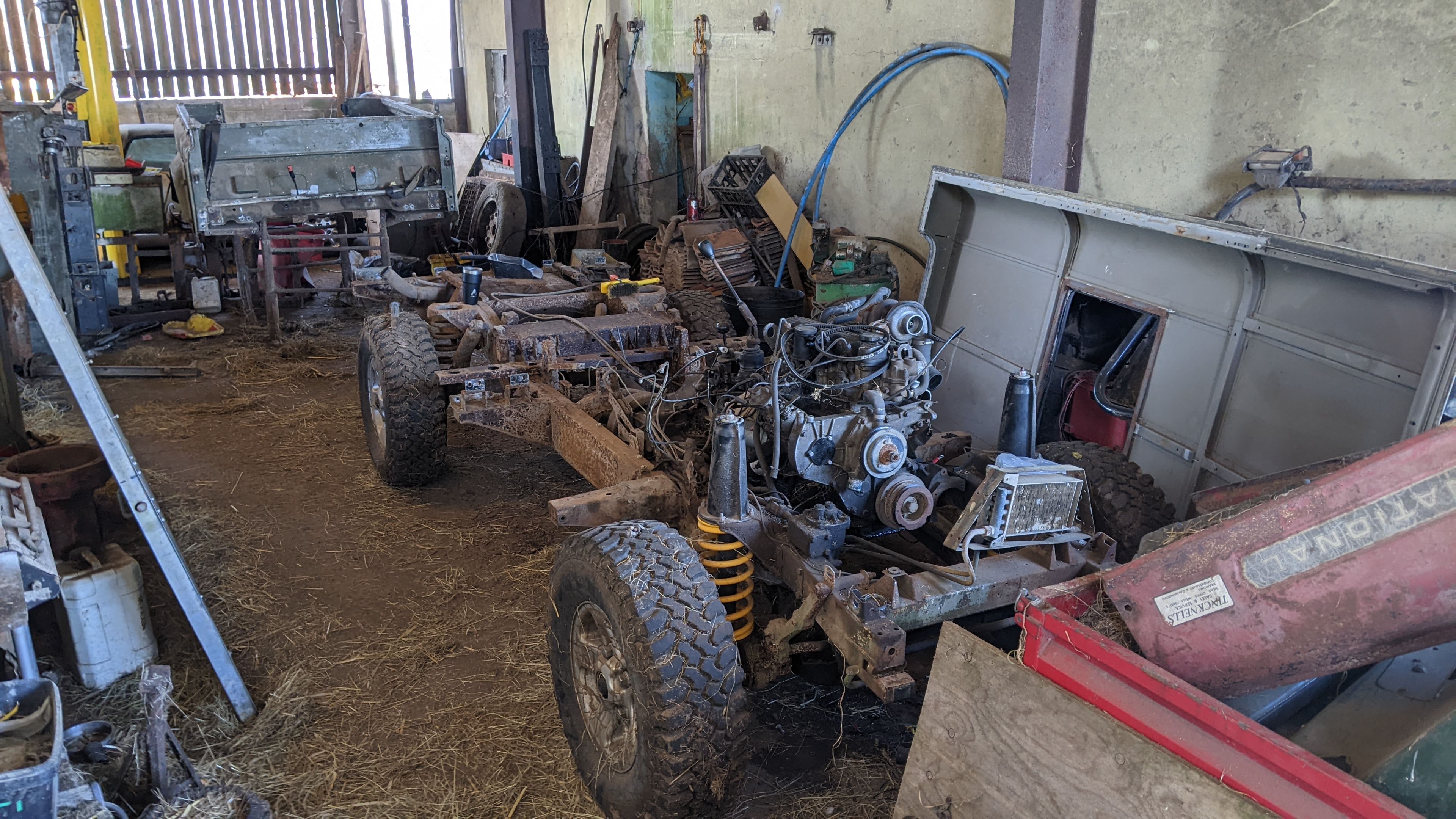 This is the stage where I left in back in 2022, last year I sold the engine and bought chassis repair parts. Now it's covered in the usual farm accumulation. Last year I also made the decision to just skip the ICE swap and convert it to electric.