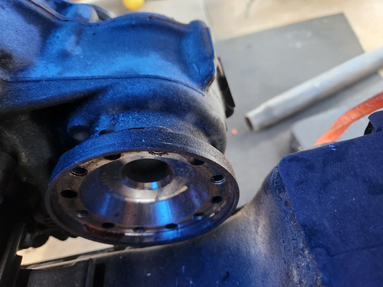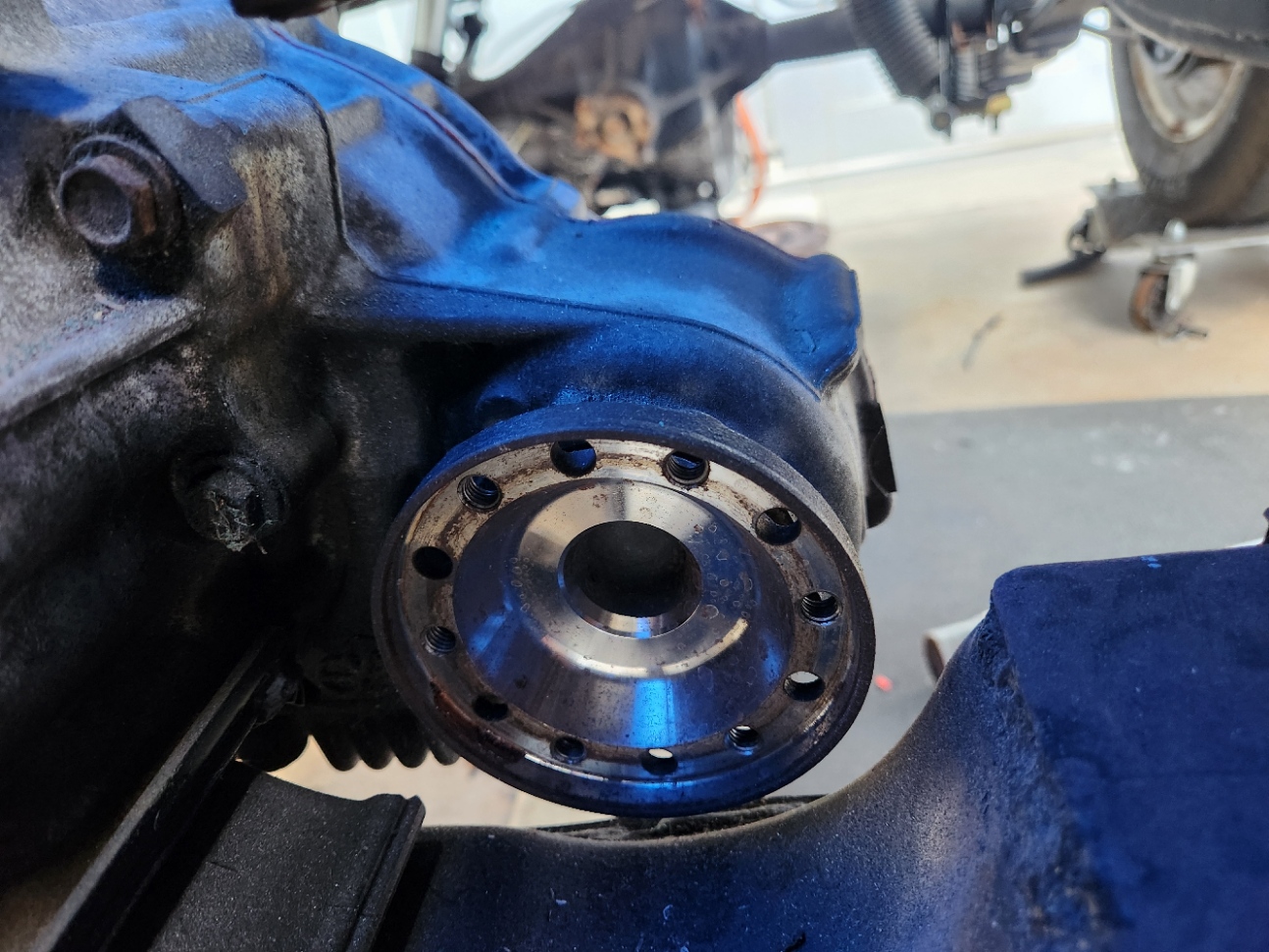 This is what I'm working with. There are 12 holes but only 6 are threaded, and those that are have more material in the back. The outer lip is ~95mm diameter. It's not removeable from the front, would need to disassemble the transfer case to get it out.