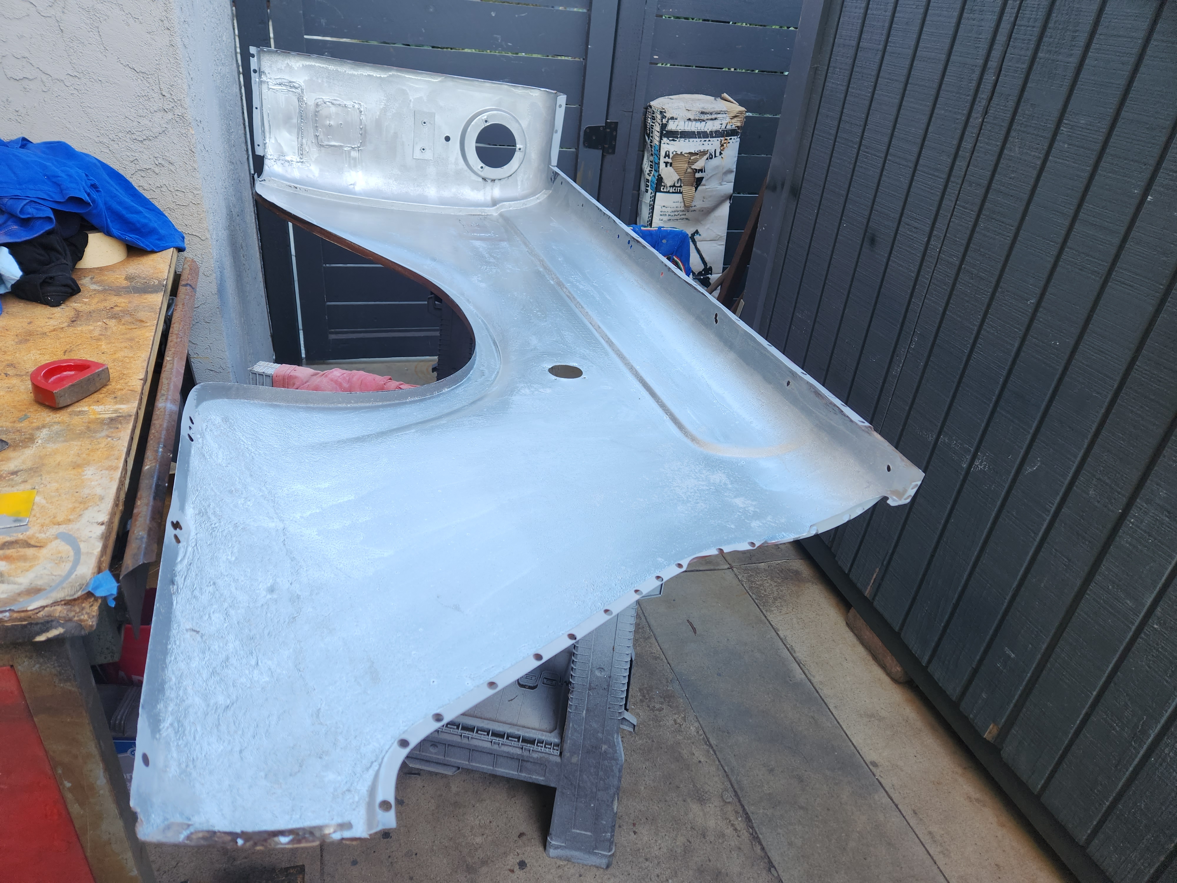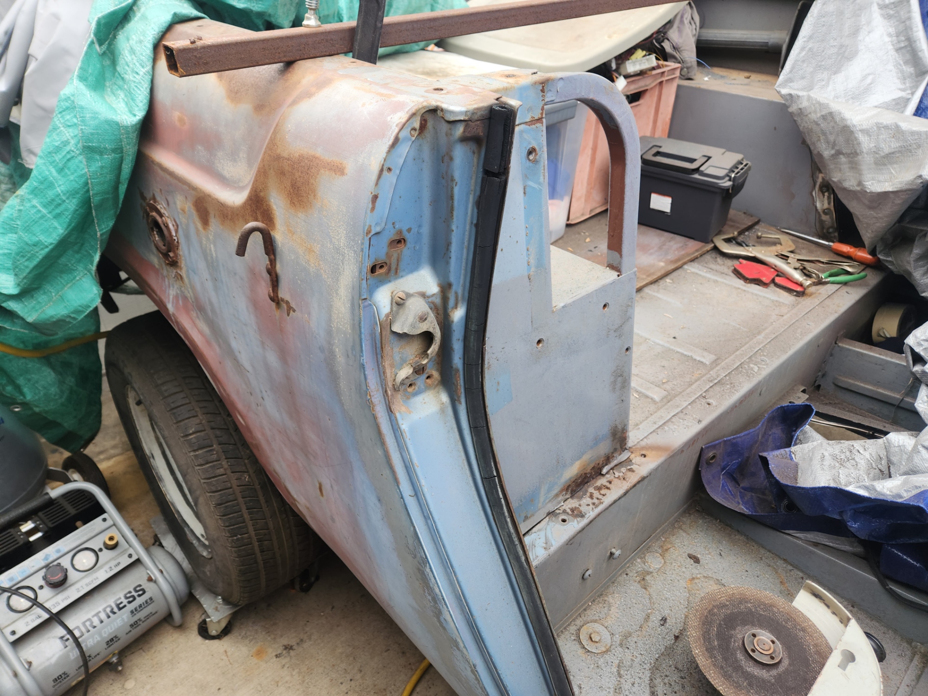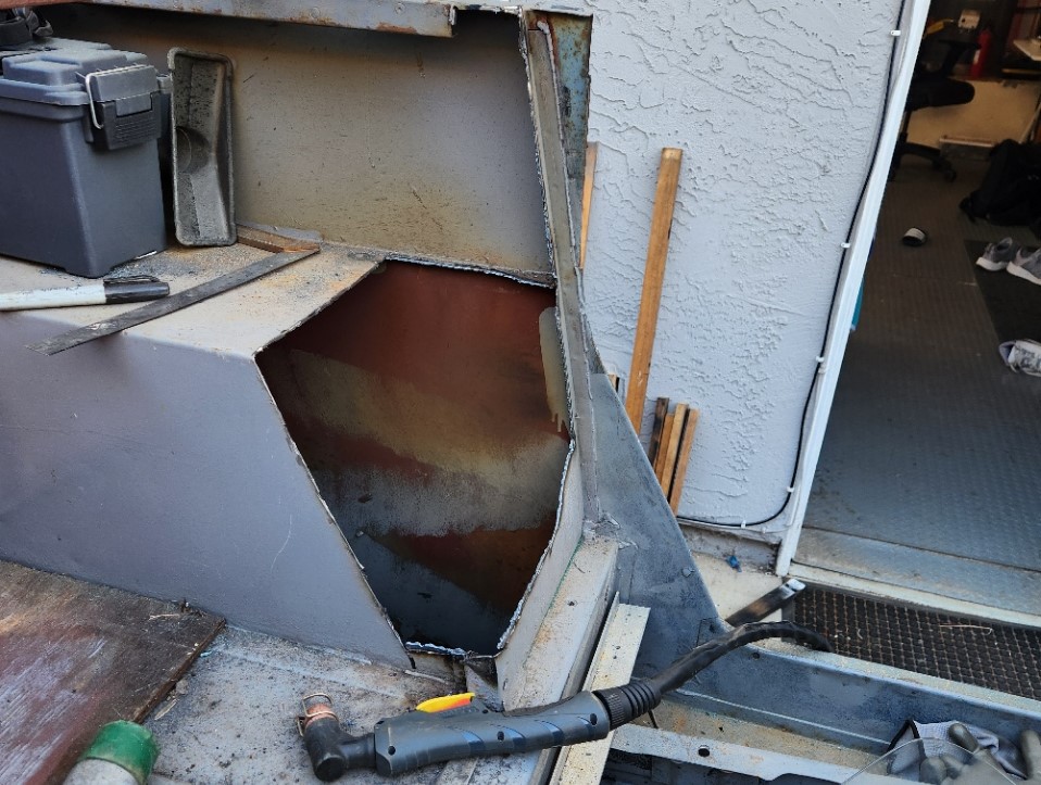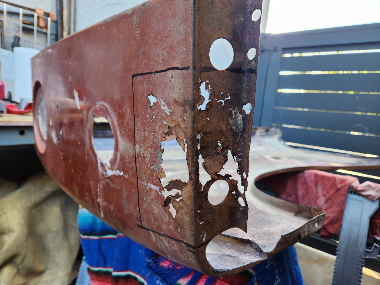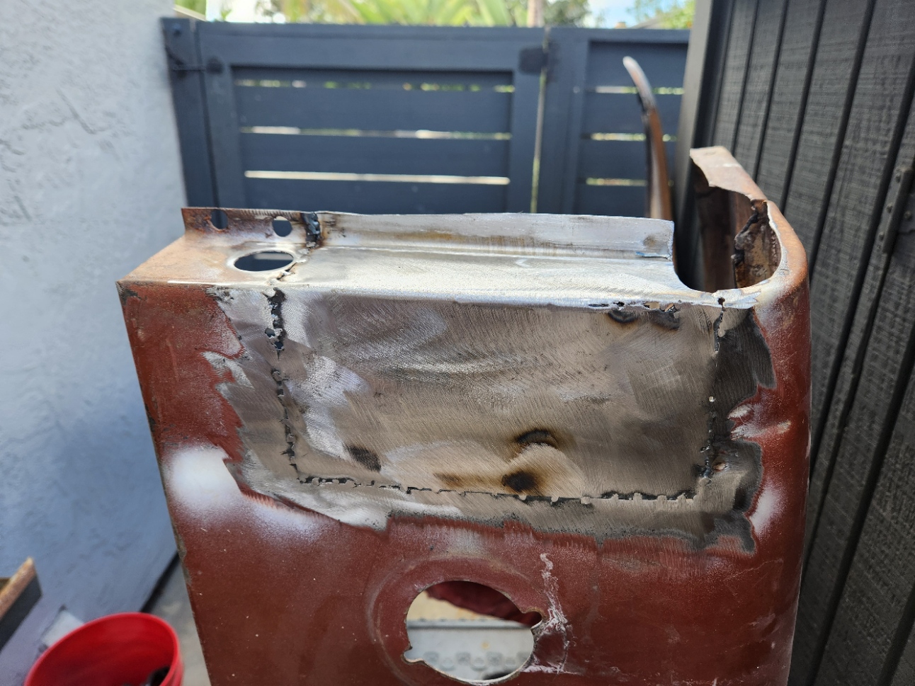 This whole panel is from another Scout, it runs from back of door and wraps around to tailgate. My original had severe damage. It had to be removed from the body tub by drilling out spot welds, so next steps will be to plug weld this guy back in. I'm going to need every clamp I have, and then some. I have a Cleco set I haven't used in years, may bust that out to help keep things straight